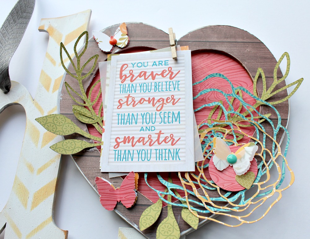 Next, I covered my frames with patterned paper. For the heart, I decided instead of a photo to adhere a sentiment as well as flowers I cut from my Silhouette and coordinating patterned paper. I also layered vellum and patterned paper butterflies by using a hand punch.