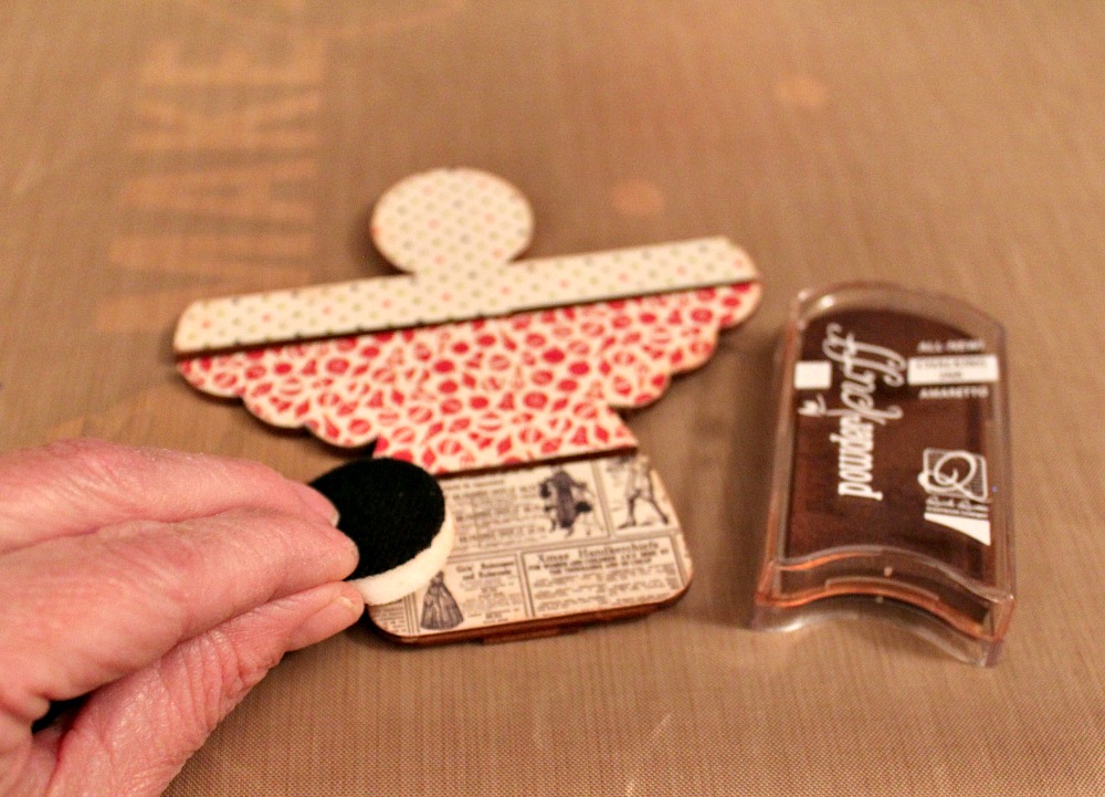 Instead of painting, I decided to cover my Angel with the patterned paper from the 6×6 Authentique Nostalgia paper pad. Using a ruler, I measured the height of each section. I then cut the pattern I wanted to use and adhered with liquid adhesive.