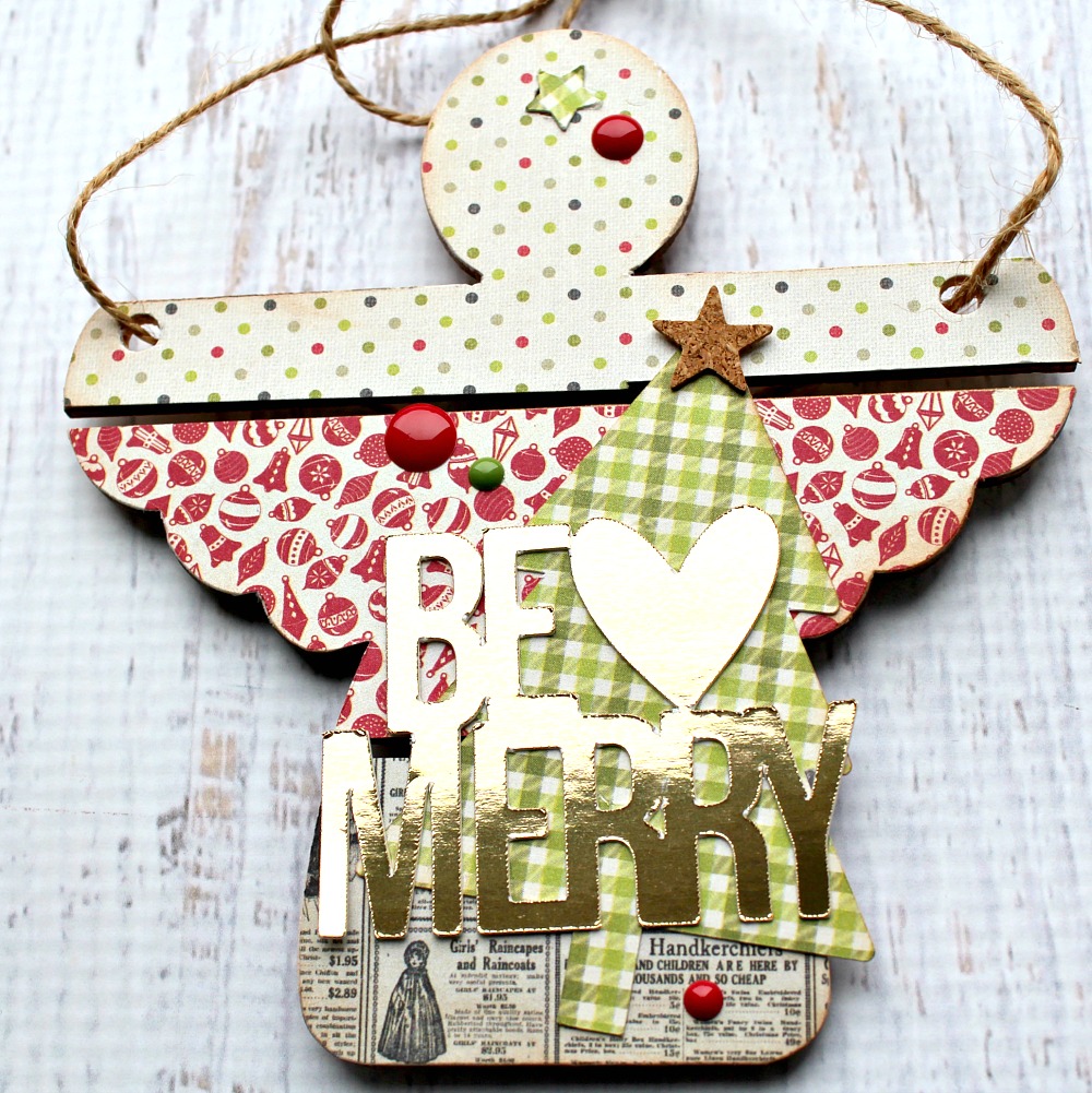 Additional products used: bakers twine: My Minds Eye; gold foil cardstock: Recollections: cut files: Simple Stories "Be Merry" #171205, "Christmas Tree" #70164; enamel dots: Simple Stories; chalk ink: Quick Quotes; adhesive: Beacon.