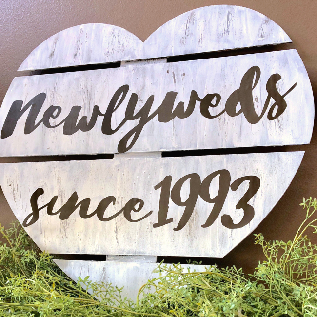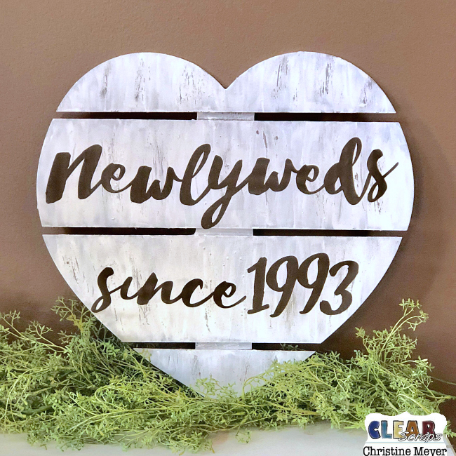 Once all the paint had dried, I cut out words using my electronic cutting machine. I considered tracing them and painting, but I had brown vinyl. I knew that would be a little less work and if it went on bad, I could pull it up and paint it instead. Thankfully it went very smoothly! I love how the whole thing came together and can't wait to see the happy couple's faces when I give it to them! Thanks for joining me today and be sure to visit the Clear Scraps Shop to get your hands on these beautiful Wood Pallets! Think about all the holiday gifts you can start creating – personalized and fun for you too!
