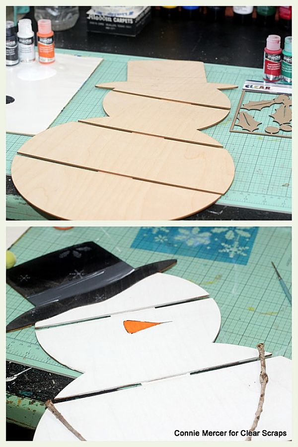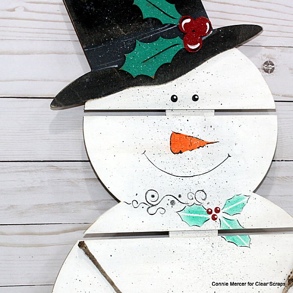 Hi, Connie here with a decorated Snowman Pallet shape by Clear Scraps. Great looking for your Christmas decor. Snowmen love hanging out on front doors, under Christmas trees or by fireplaces. See what you think~