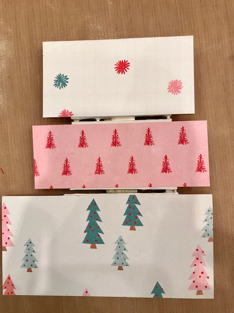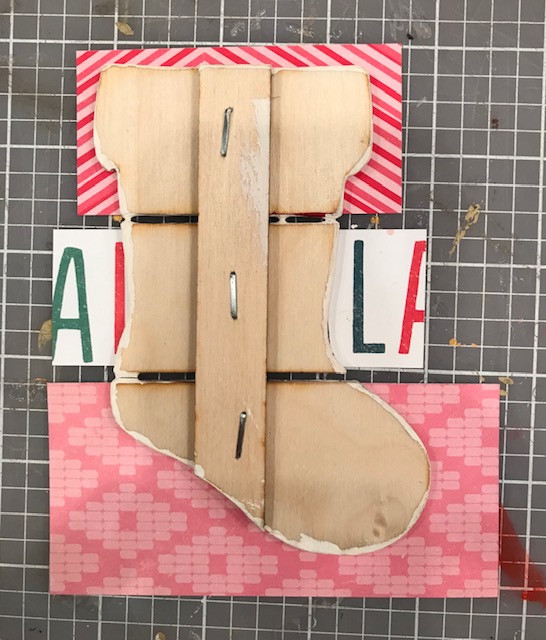After allowing my paint to dry, I measured and cut strips of patterned paper to adhere to the "slats" of the Stocking. I found that its best to use a liquid adhesive that is solvent based such as Beacon 3-in-1 or Zip Dry.