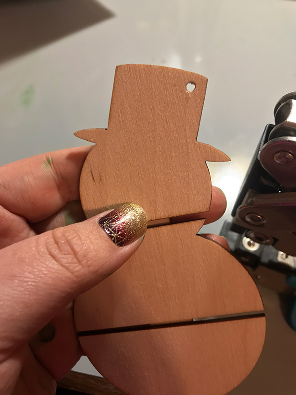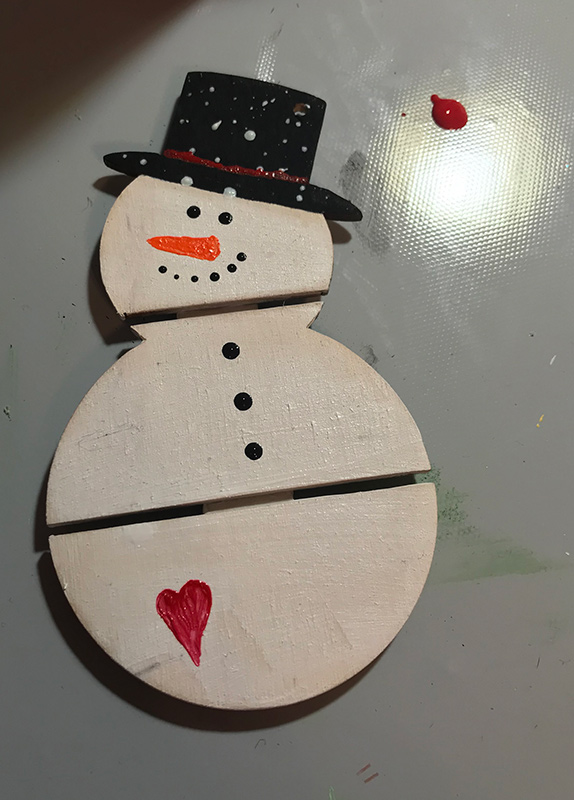 Once I punched the hole through, I painted the snowman with all the details you may want on your snow-person.