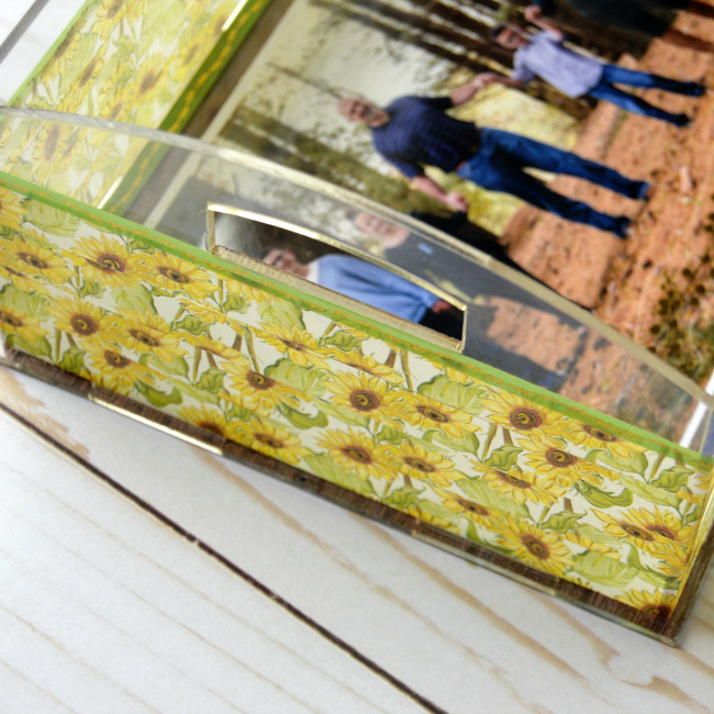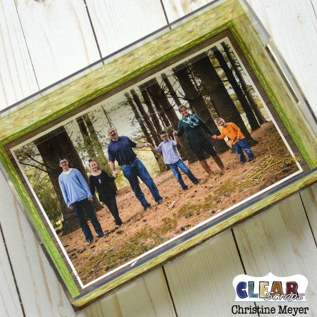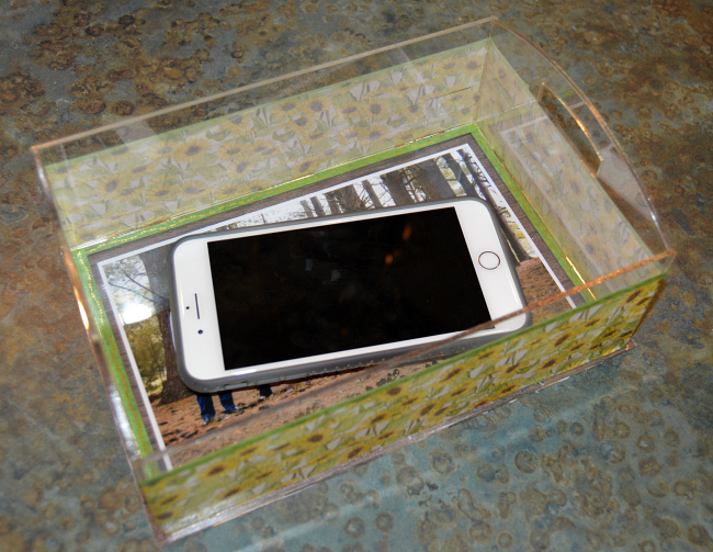 I'm a sucker for pictures! In fact pretty much my entire life, I've had pictures in my decor in as many places as I could! So knowing that this box was clear, it was an opportunity! I went ahead and matted my picture with both white cardstock and then patterned paper. I then put that on the bottom of the box – so the picture is covered up by the acrylic. I used a strong adhesive along the edges to hold it on there. I used the green washi tape that you see to hide that ;).