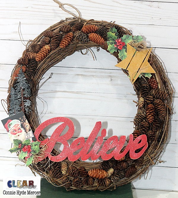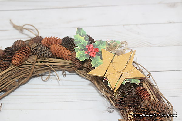 Hi, Connie here with a Christmas wreath using some of the festive embellishments by Clear Scraps. I used chipboard trees, a mini star pallet shape and a large birch wood script word to create this Christmas wreath.