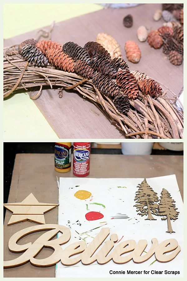 After the pine cones were attached to the front of the wreath, the script word, trees and star were painted with acrylic paints. The script word and star were sanded down to create a distressed look. The embellishments were speckled with watered down white paint.