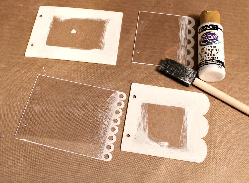 After removing the protective film from both sides of the acrylic pieces, I painted the edges of my pages with white acrylic paint. For the chipboard pieces, I knew I was going to add patterned paper to both sides so I painted about an inch in. For my acrylic pages, I only painted the front as well as lined the outside edges. You do not have to make the paint lines perfect on the acrylic as it creates a nice "snowy" effect.