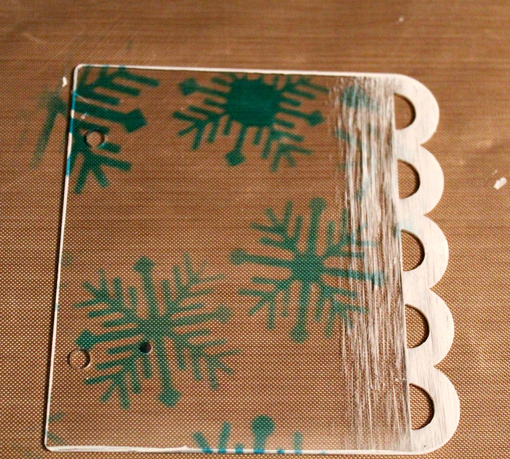 Taking the front acrylic page, I used the 6 Inch Nordic Snowflake Mascil with StazOn in Teal. It was helpful to apply in layers and dab the ink.