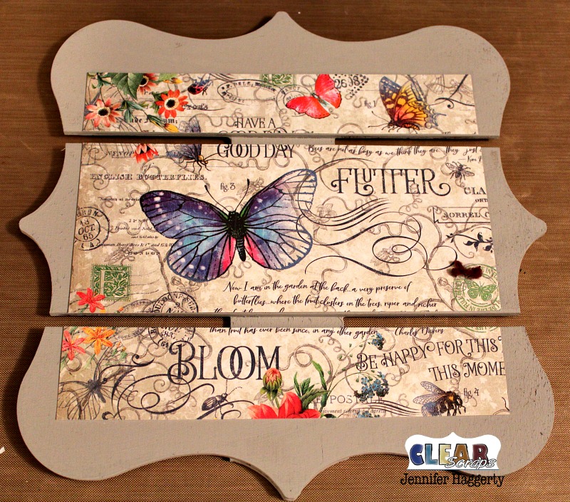 I began by painting my pallet in grey chalk paint. Then, I chose a fun pattern from the Graphic 45 8×8 Flutter Paper Pad. I cut my paper down to fit just inside my pallet. I cut my background into strips to fit the slats of the pallets.