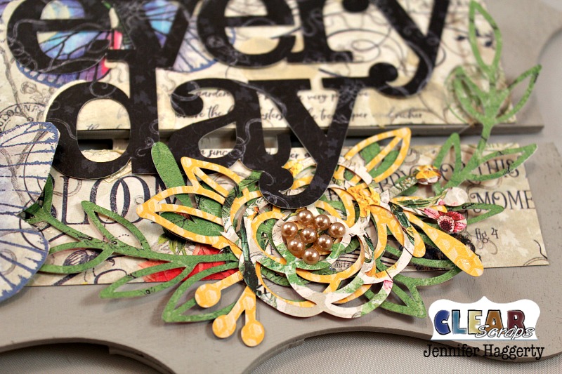 I then used different patterns from the paper pad with my Silhouette to cut flowers as well as my title. The strips of bling from Want 2 Scrap are perfect accents! Here, I applied a cluster to the middle of my flower.