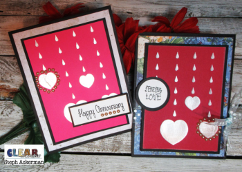 I created cards from black cardstock and matted each stenciled panel with black cardstock so the panel would pop. Using papers from the Graphic 45 Flutter collection, I assembled the red card, placing ribbon between the layers. To finish I added Want2Scrap pearls around one of the hearts. A small sentiment was then added to the left side.