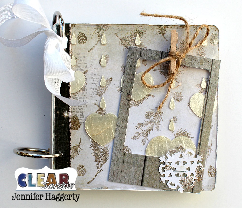 I began removing the protective film from both sides of all the acrylic pages. Then taking the front cover, I secured the 6 Inch Rain Drops Heart Mascil over the top with painters tape (washi tape works too). The Viva Modellier Creme included in the kit is fun to work with and looks beautiful on the acrylic! Using a spatula, I applied a thin layer across the acrylic. Once dry, I cut a 4×4 piece selected from the Frozen Forest 6×6 Paper Pad using my corner rounder to fit the cover. I then applied a thin line of liquid adhesive to the back of my cover so that my paper would "show through" the front.