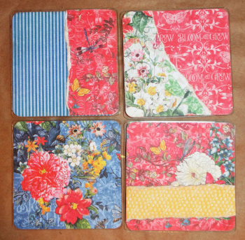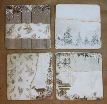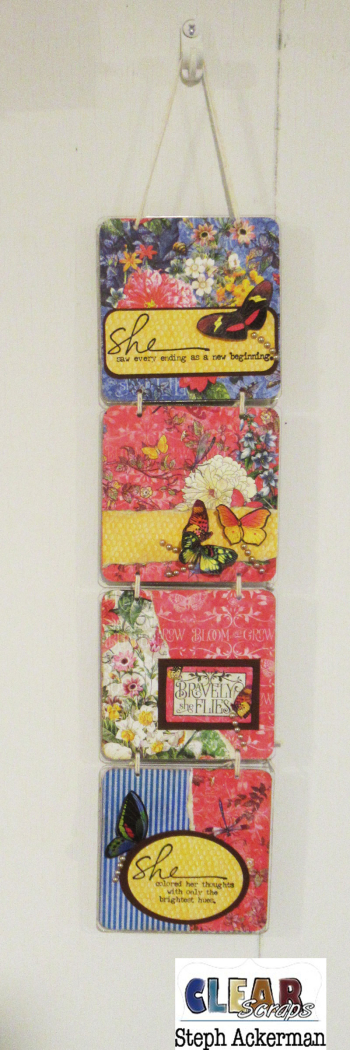 I cut pattern papers slightly smaller than the acrylic panels and inked the edges before adhering. Additional papers were torn, inked and added to the panels creating 8 different panels.