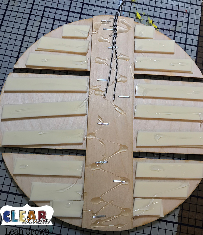 Do this all over the backside of the circle. Peel away the foam tape backing, and apply a strong liquid adhesive.