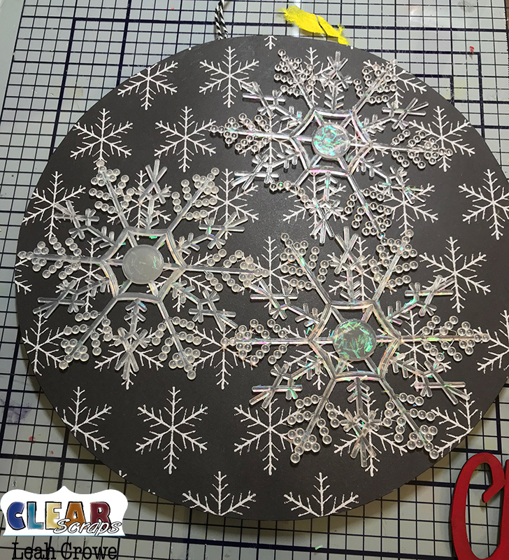 Adhere to your pattern paper. Then, adhere your snowflakes. I found mine in the dollar section at Michaels.