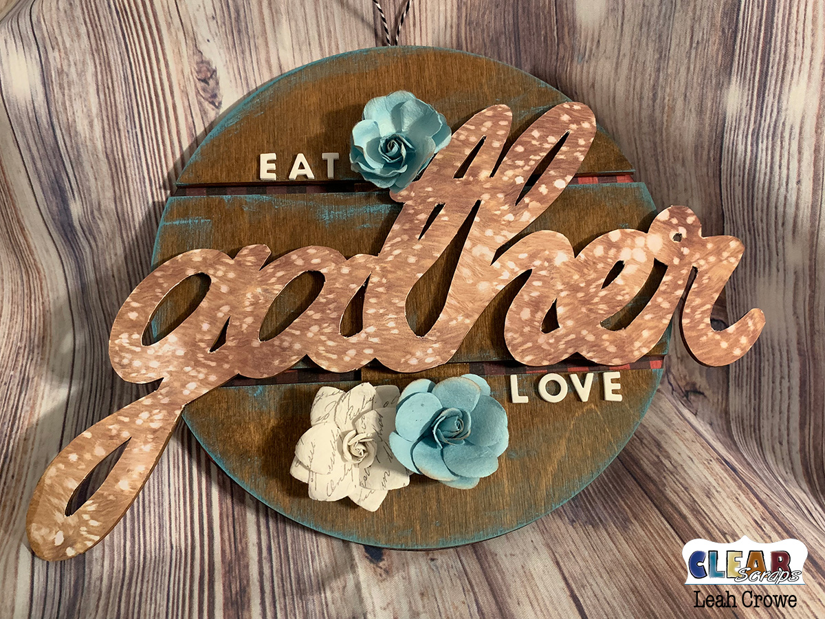 To start, I adhered pattern paper to the wood word, gather.