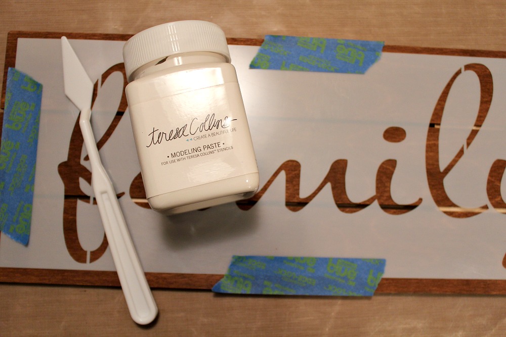 After allowing my paint to dry, I secured the new Family Farmhouse 6×16 Stencil to my pallet with painters tape. Washi tape works well, too! There are 20 new designs including this one! And the possibilities are endless when it comes to DIY home decor projects!