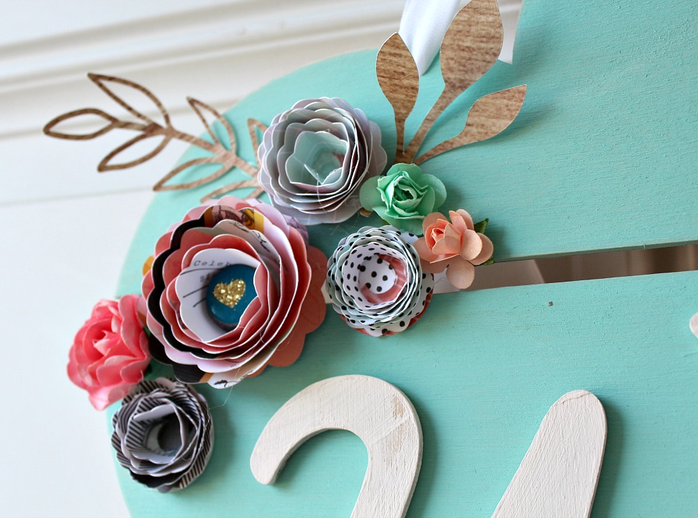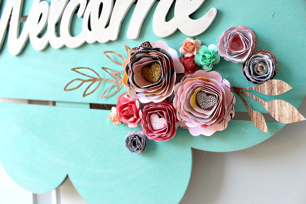 For accent, I used my Silhouette to cut rolled flowers in different sizes to cluster around my Wood Word. I also added in paper flowers from my stash, as well.