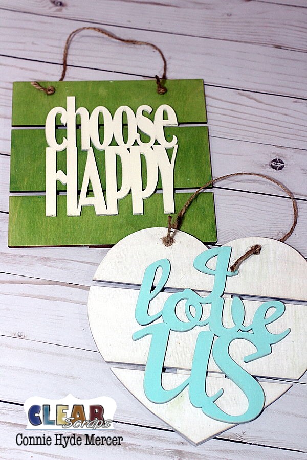 Hi, Connie here with a fun project using the new Medium DIY Pallets with the new Script Word Quotes by Clear Scraps. These were designed to go together and they look fabulous all dolled up with paint and pretty paper. My projects were painted with acrylic paint, but paper looks amazing too.