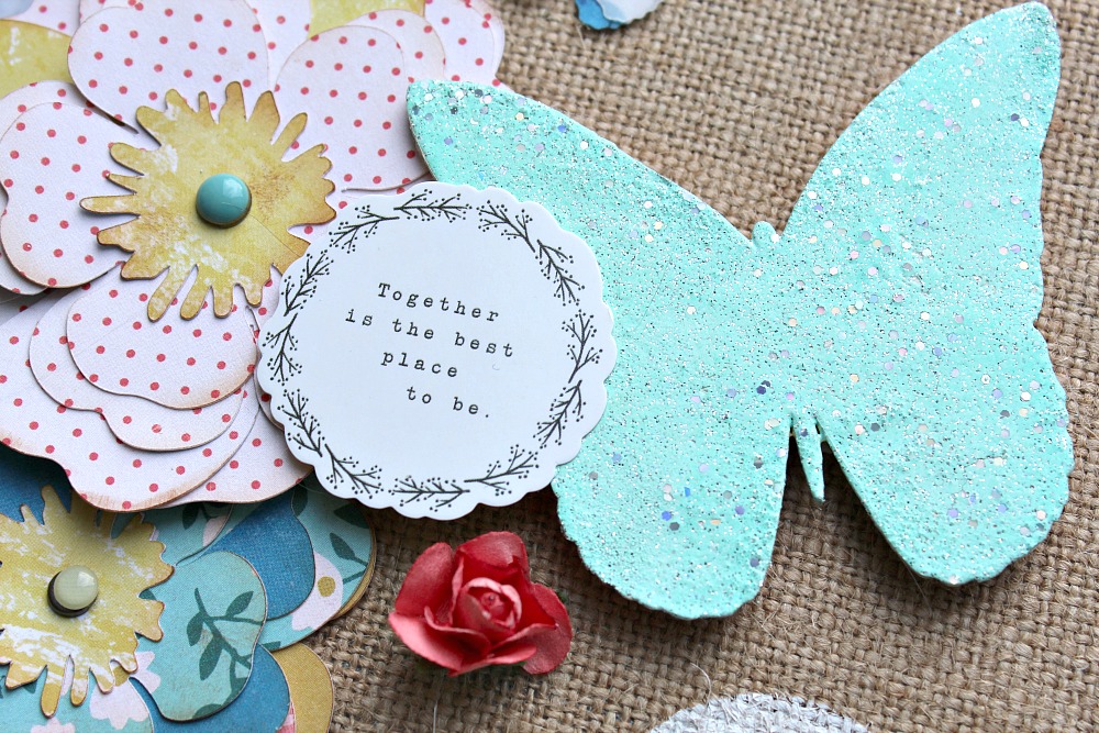 Here, I used one of the Monarch Butterfly Chipboard Embellishments that I painted white. I then heat embossed with a glitter teal color to give it extra pop. Then using my Silhouette, I cut layered flowers with different patterns and fastening brads in the center. I also adhered a few paper flowers in with my embellishments for more dimension.