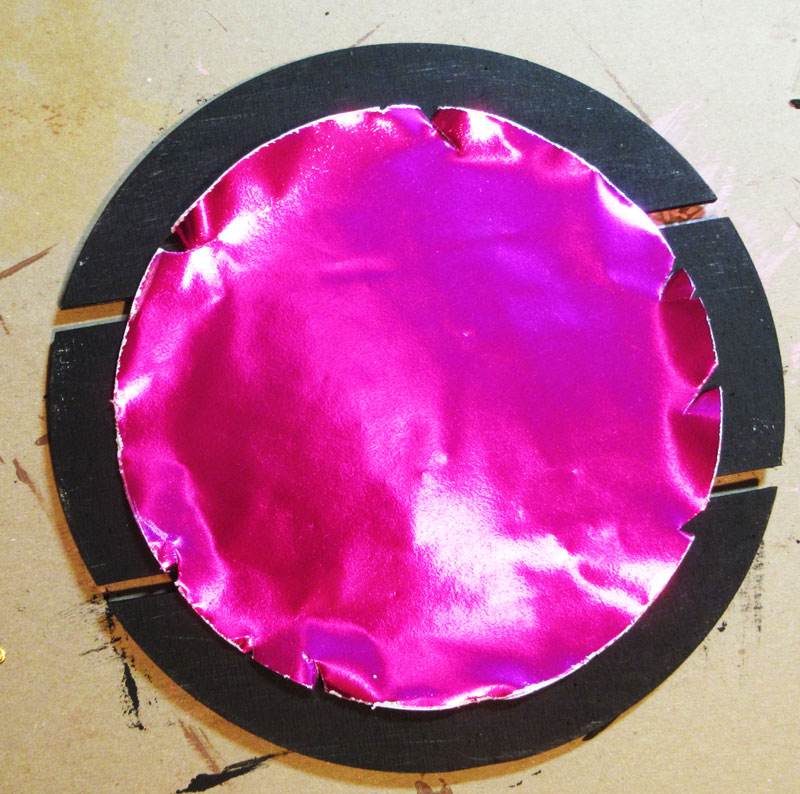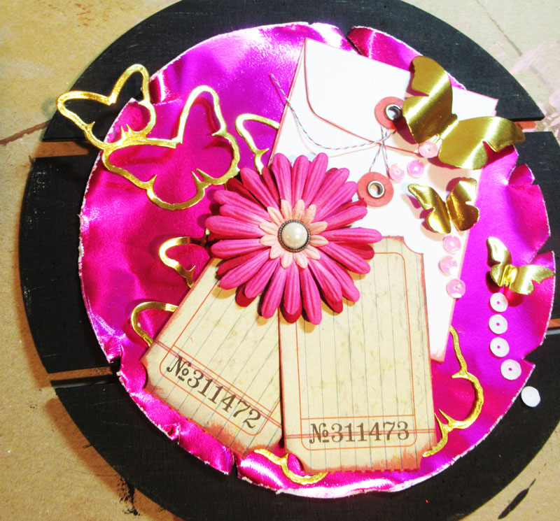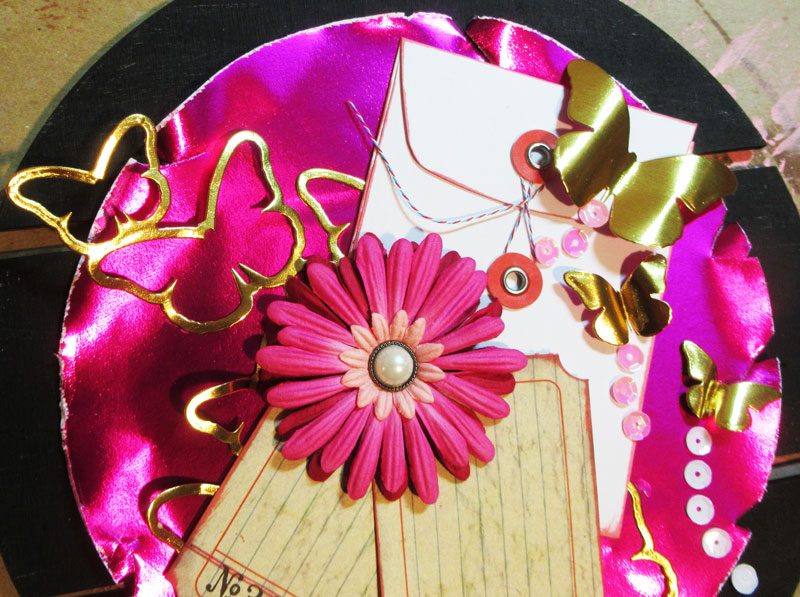 I cut Rinea Fuschia/Gold Glossy Foiled Paper smaller than the pallet then distressed the edges before adhering it to the panel.