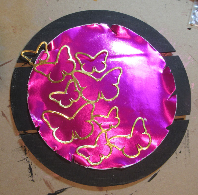Next, I die cut butterflies from Rinea Gold/Gold Glossy Foiled Paper and adhered them to the Fuschia Foiled Paper to serve as the base of my project.