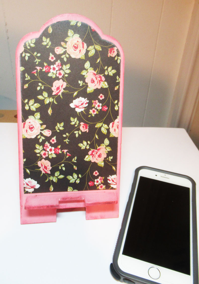 I'm using the Vintage Wood Phone Stand which has a pretty scallop shape and measures approximately 4" x 8".