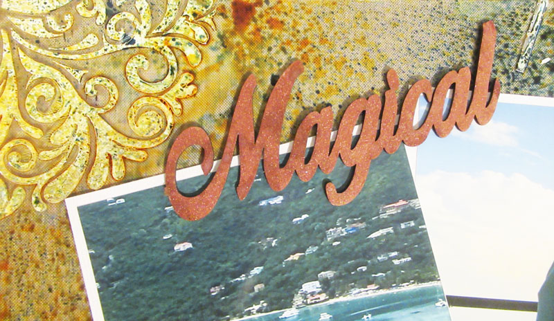 Next, I selected one the chipboard word titles - Magical chipboard word title – and spritzed it with Fireworks! Shimmery Craft Spray. When dry, I placed it above the photos on the acrylic layout.