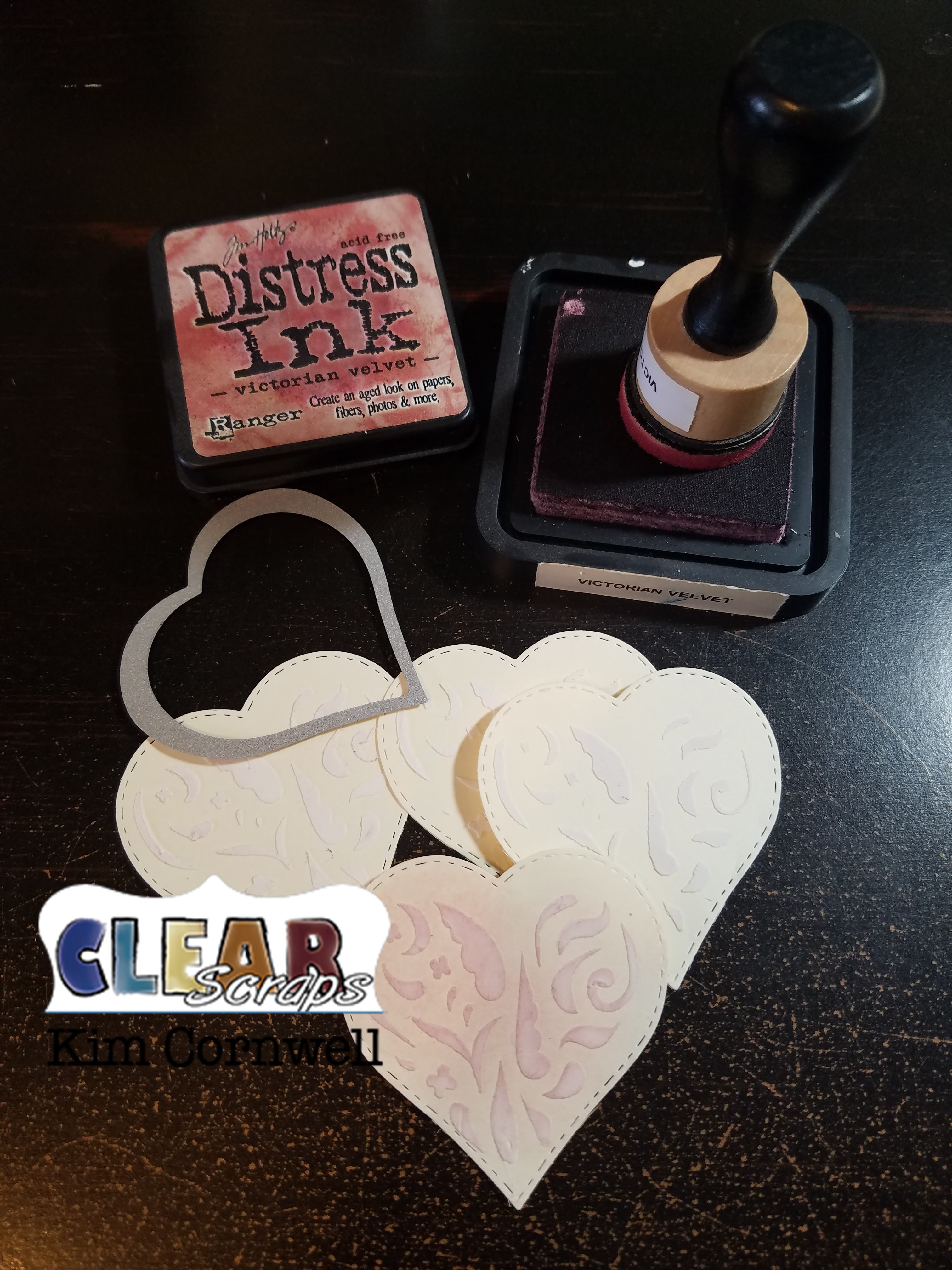 When the paste dried I then cut them out with a heart shaped metal die and inked them with Victorian Velvet distress ink.