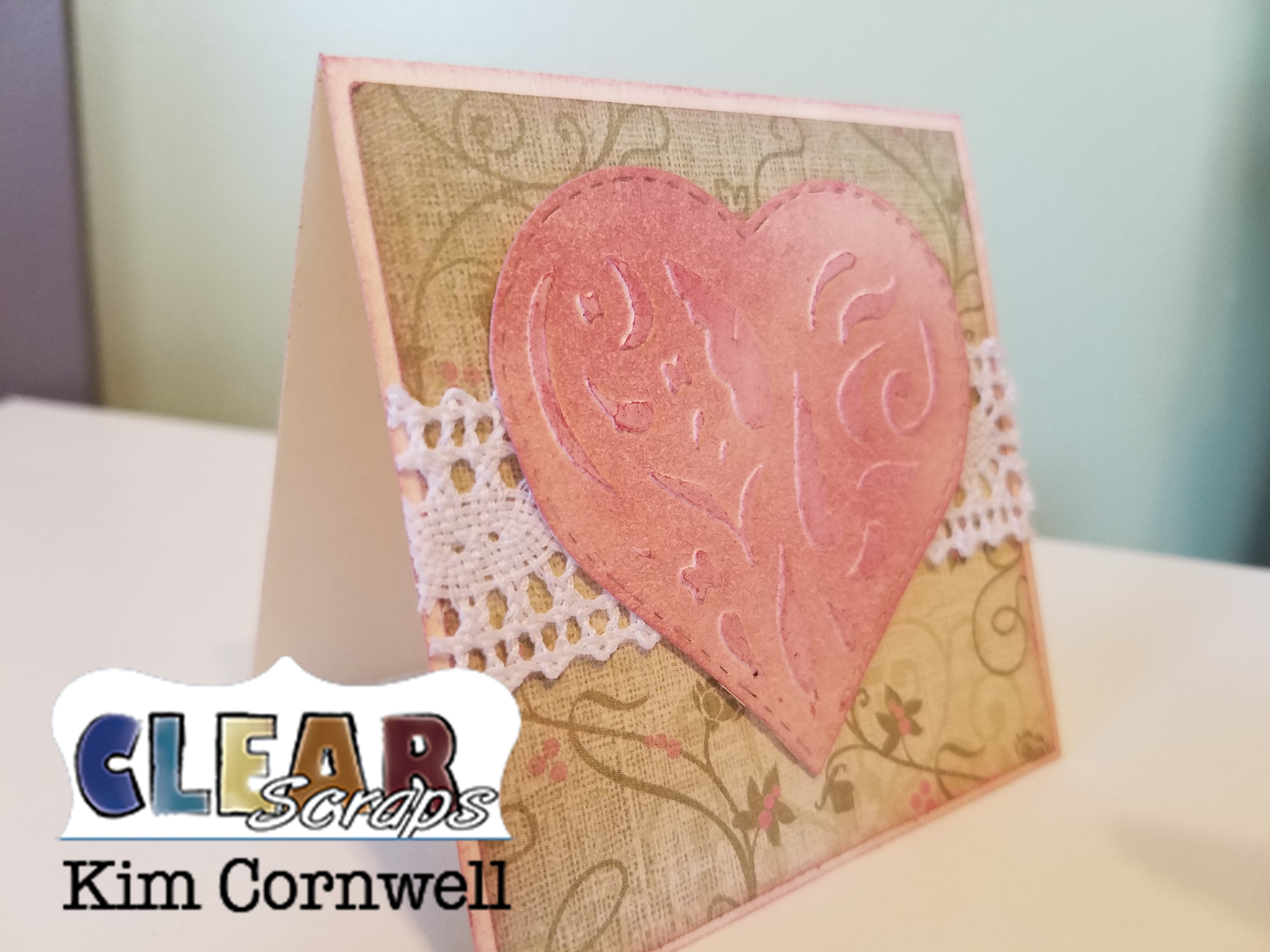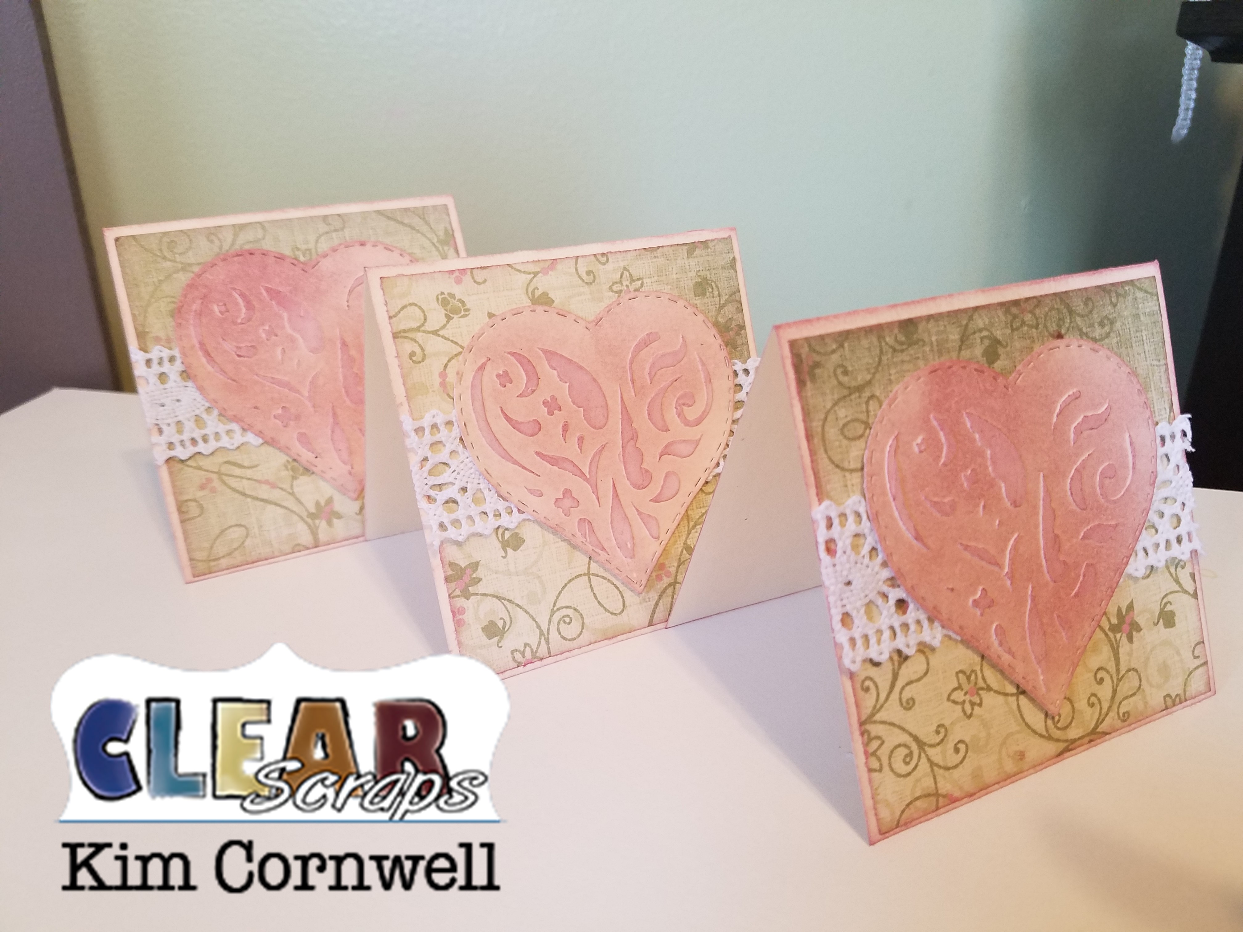 After I cut them out I added them to some 3×3 notecards. I added some pattern paper and a little lace. I popped up the hearts with foam dimensional's.