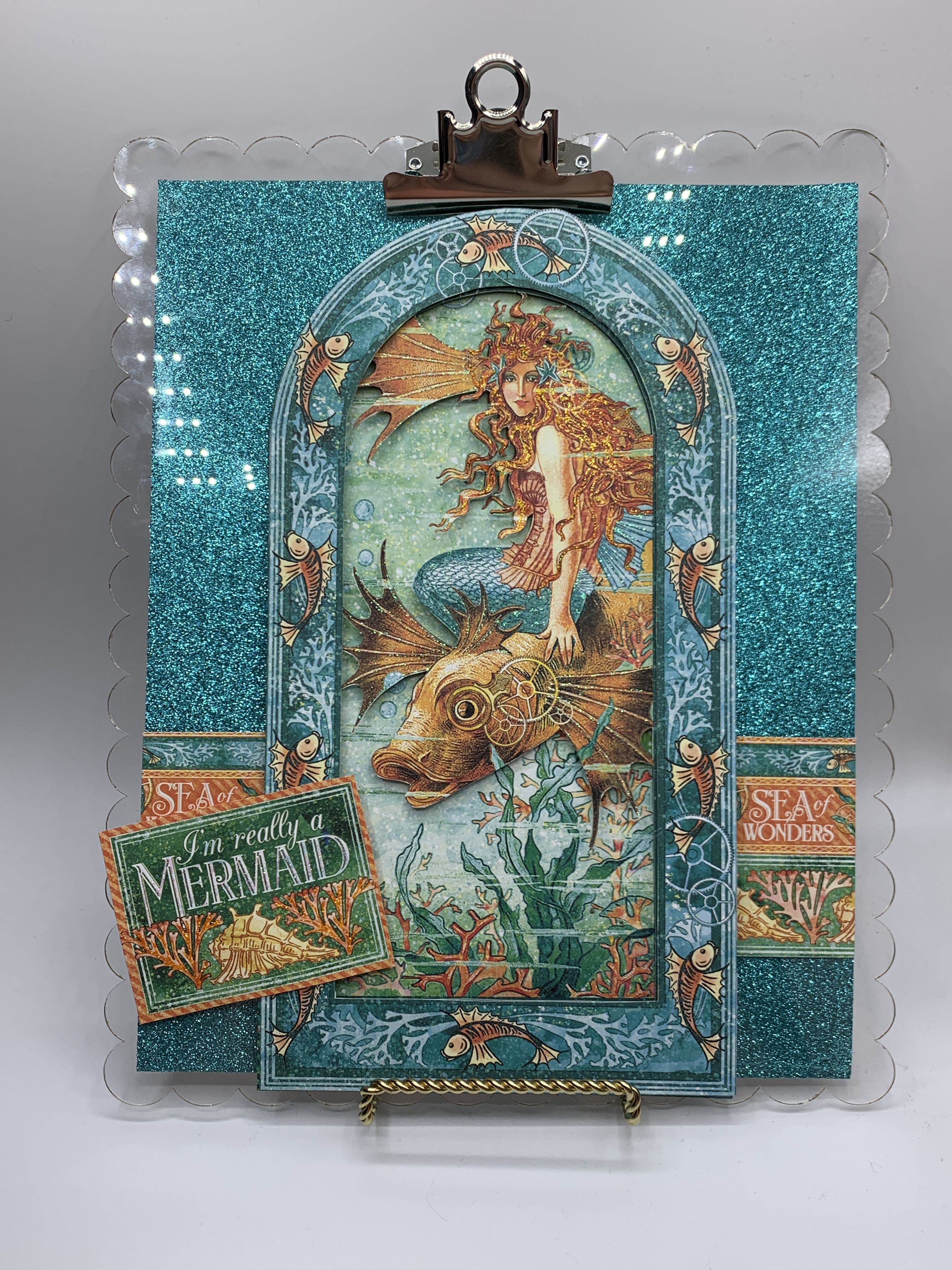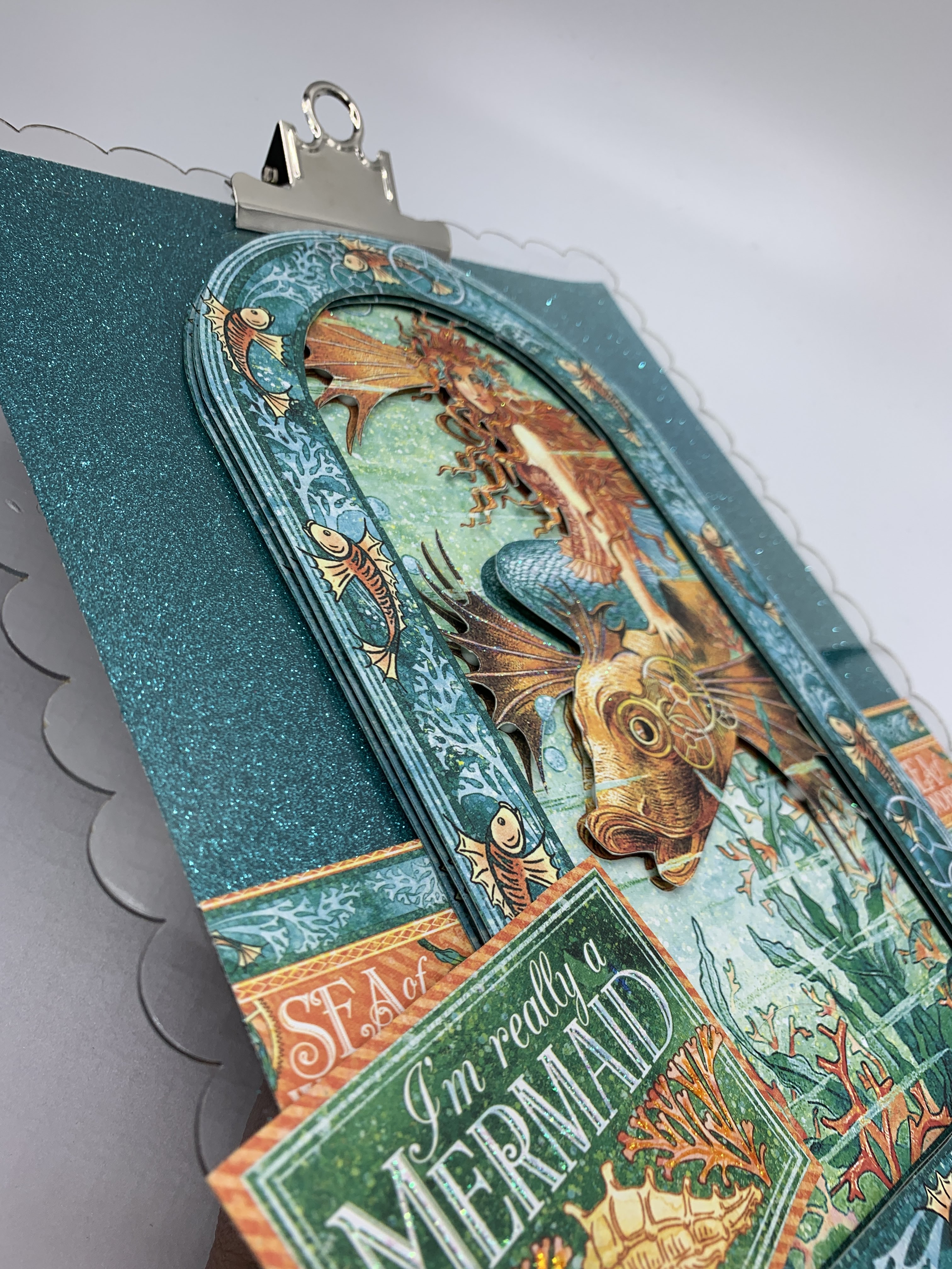 Greetings from beneath the sea! Today I am excited to share my altered Scalloped Clipboard. Rather than creating a office usable clipboard, I choose to turn my clipboard into a piece of art! I chose to make good use of the transparency of the acrylic clipboard by decorating both the under and top sides of clipboard! You can see the dimension it creates!