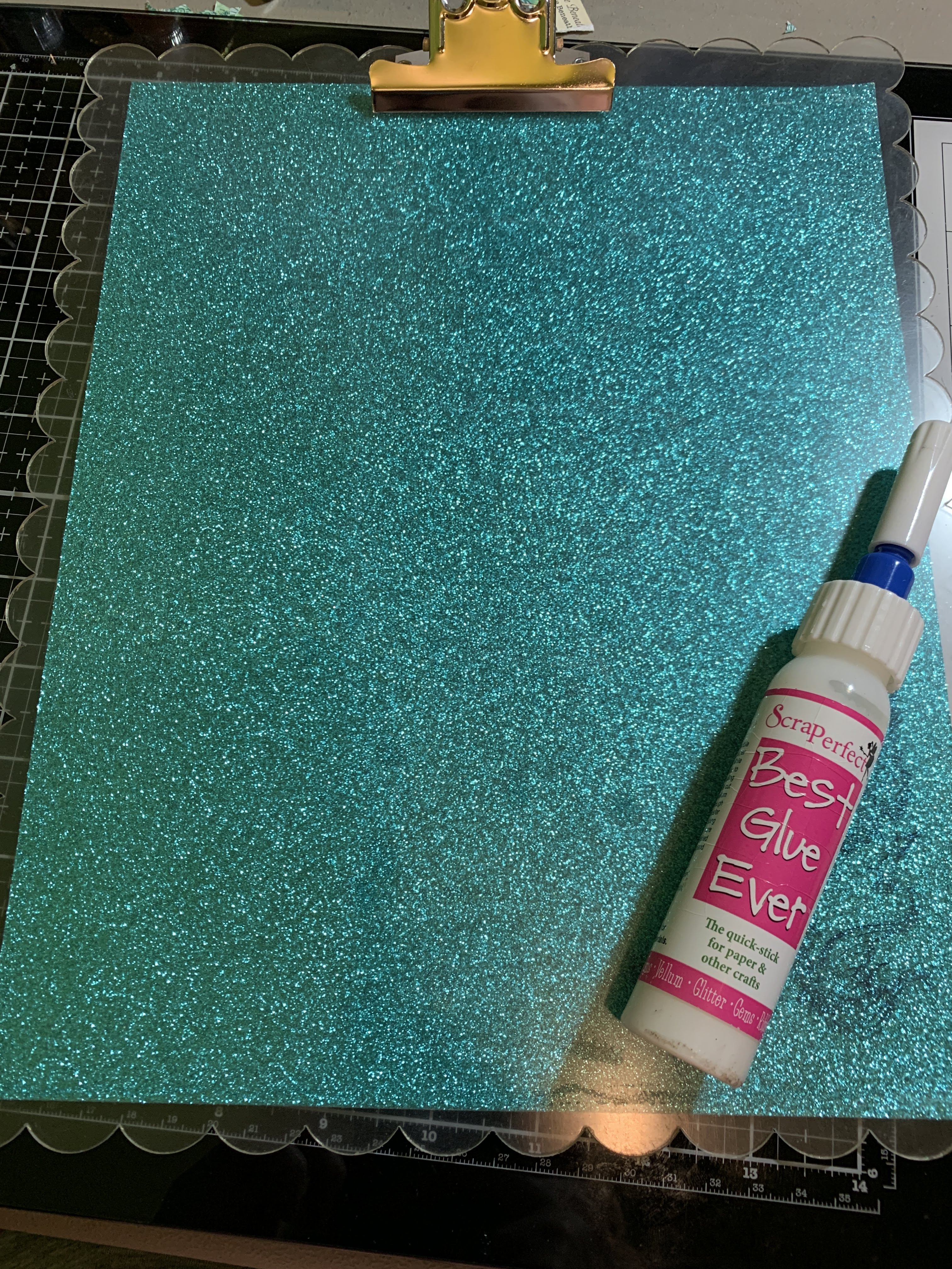Start by gluing the glitter card stock on the under side of clip board. Be sure to use a clear adhesive when gluing on the under side of clipboard. (note: you will need a strong adhesive to adhere the glitter card stock)