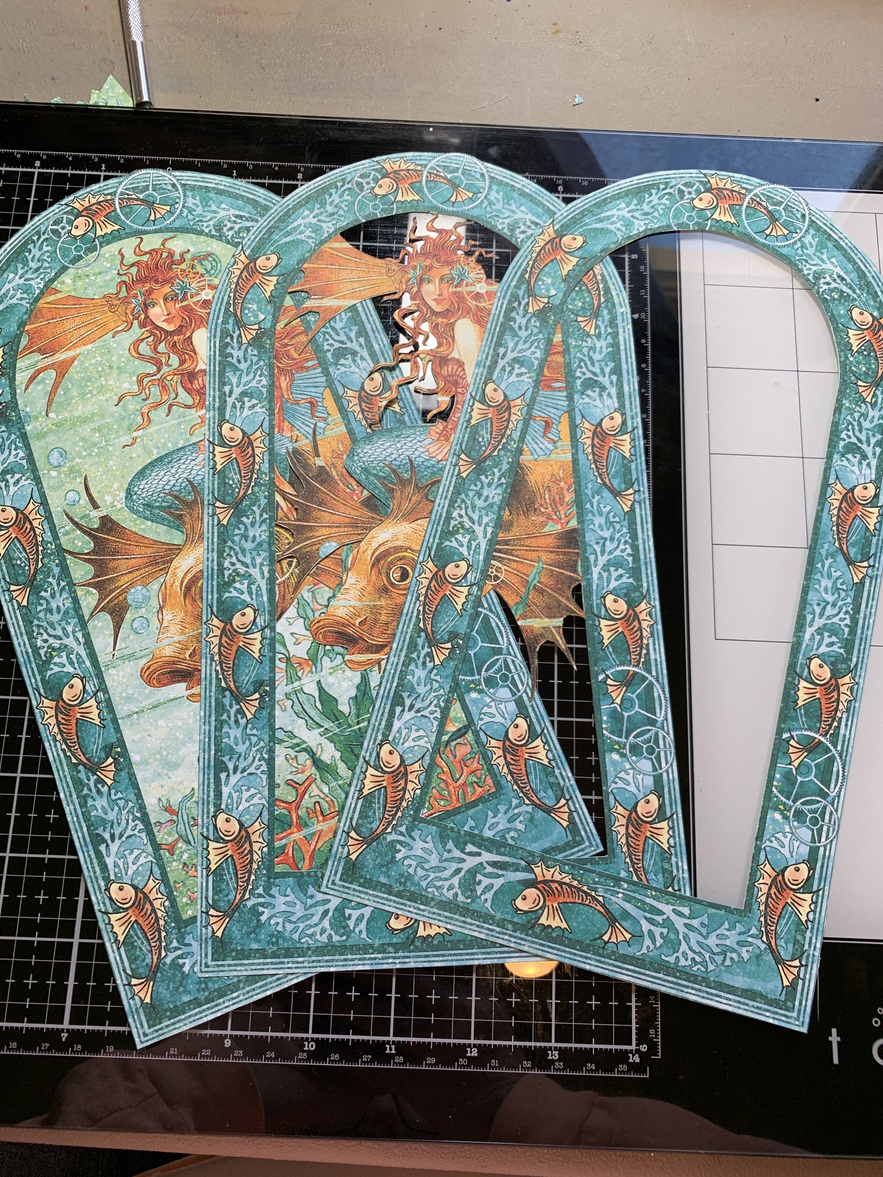Create 3 – dimensional mermaid focal point by fussy cutting layers of mermaid papers.