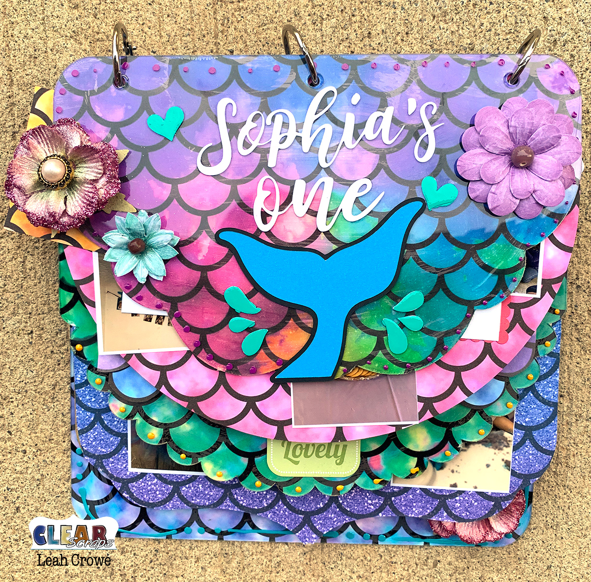 This album is mixed with three acrylic pages and two chipboard pages. I started by printing off pattern paper I found in Silhouette Studio. The mermaid paper was perfect for my granddaughters birthday theme party she had recently.