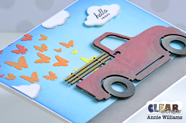 Hi everyone! It's Annie, and I'm back today with a bright and cheery springtime card made with some stencils and a really cute chipboard truck. I live out in the country and see old farm trucks like this almost every day…they're usually carrying hay or boxes of veggies, but wouldn't it be nice if they were spreading butterflies once in a while?