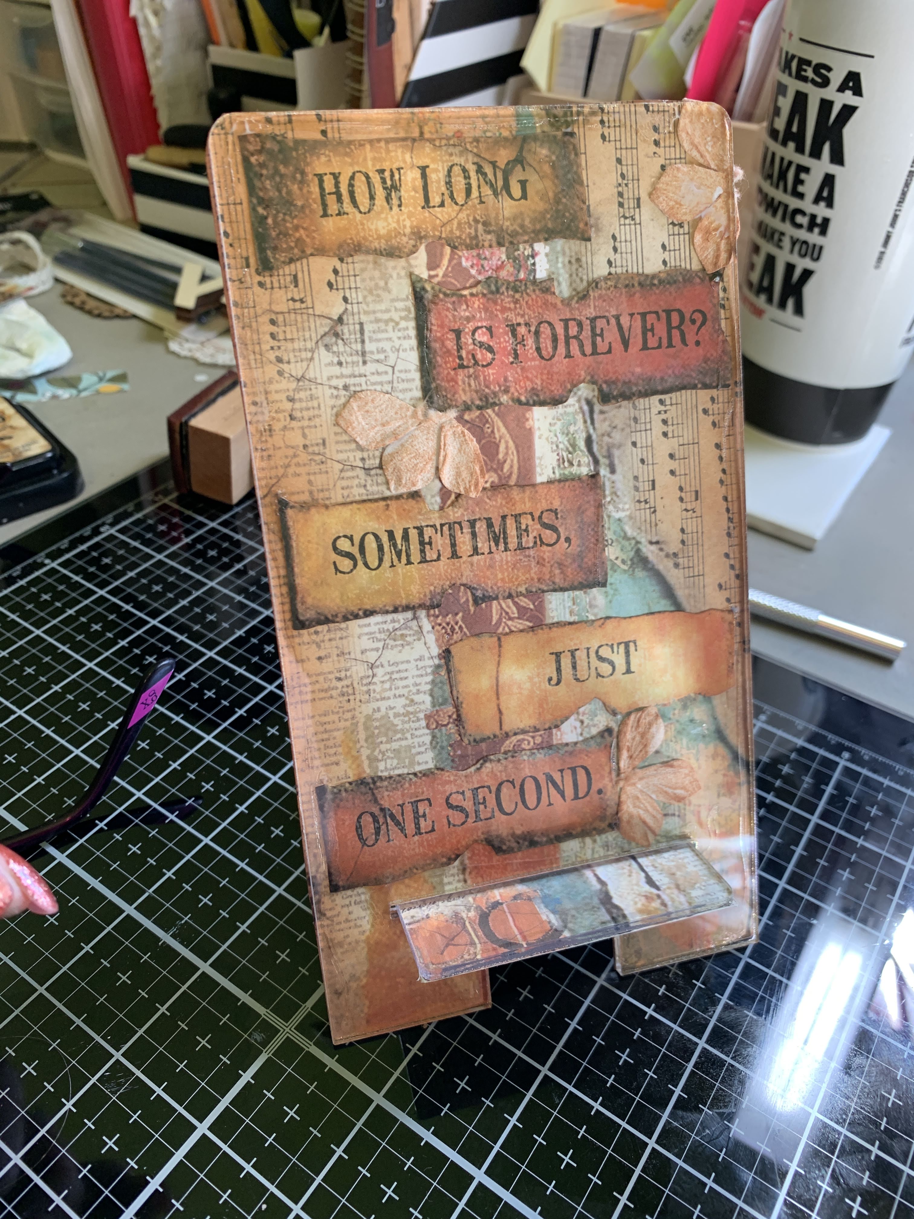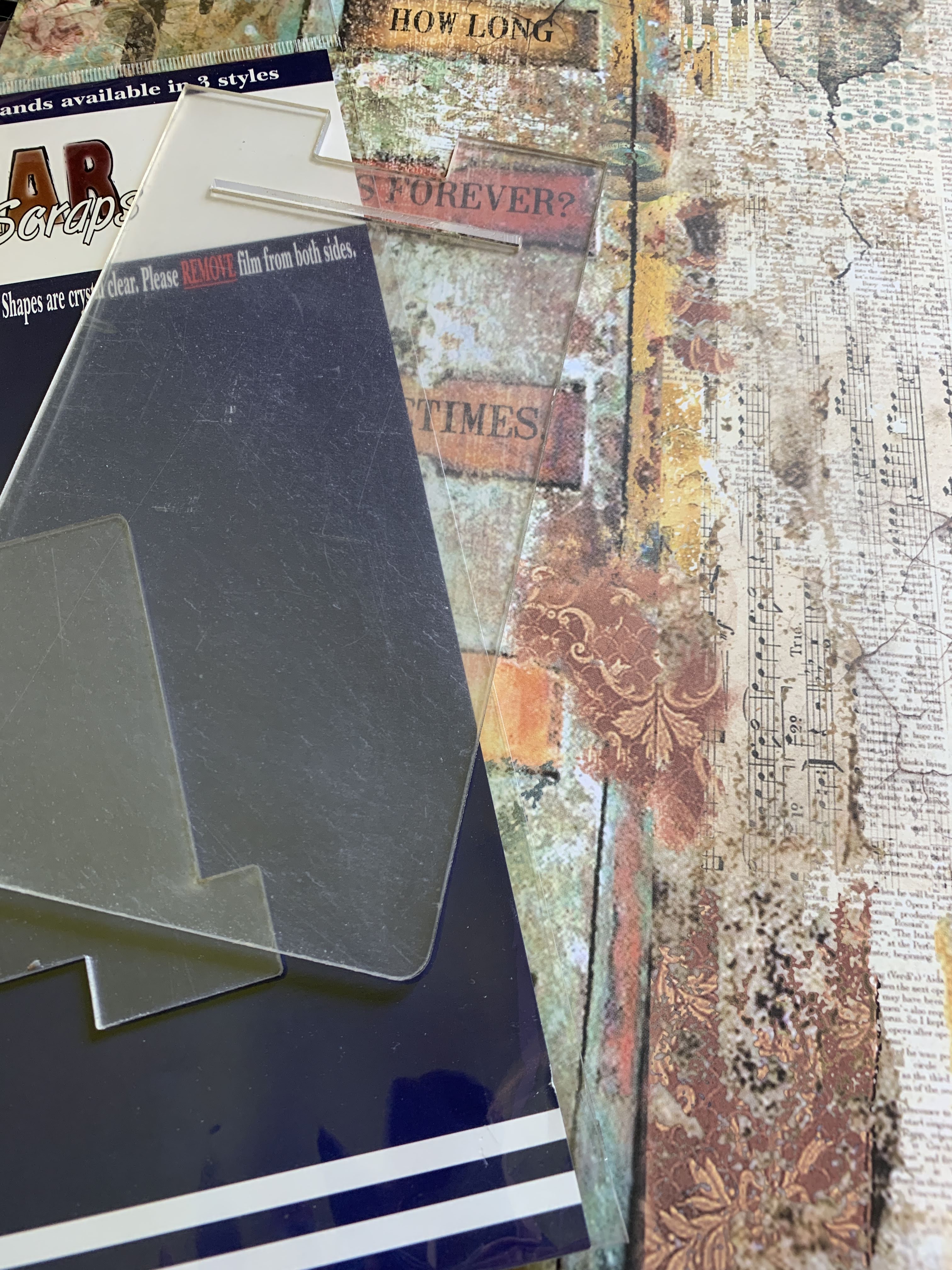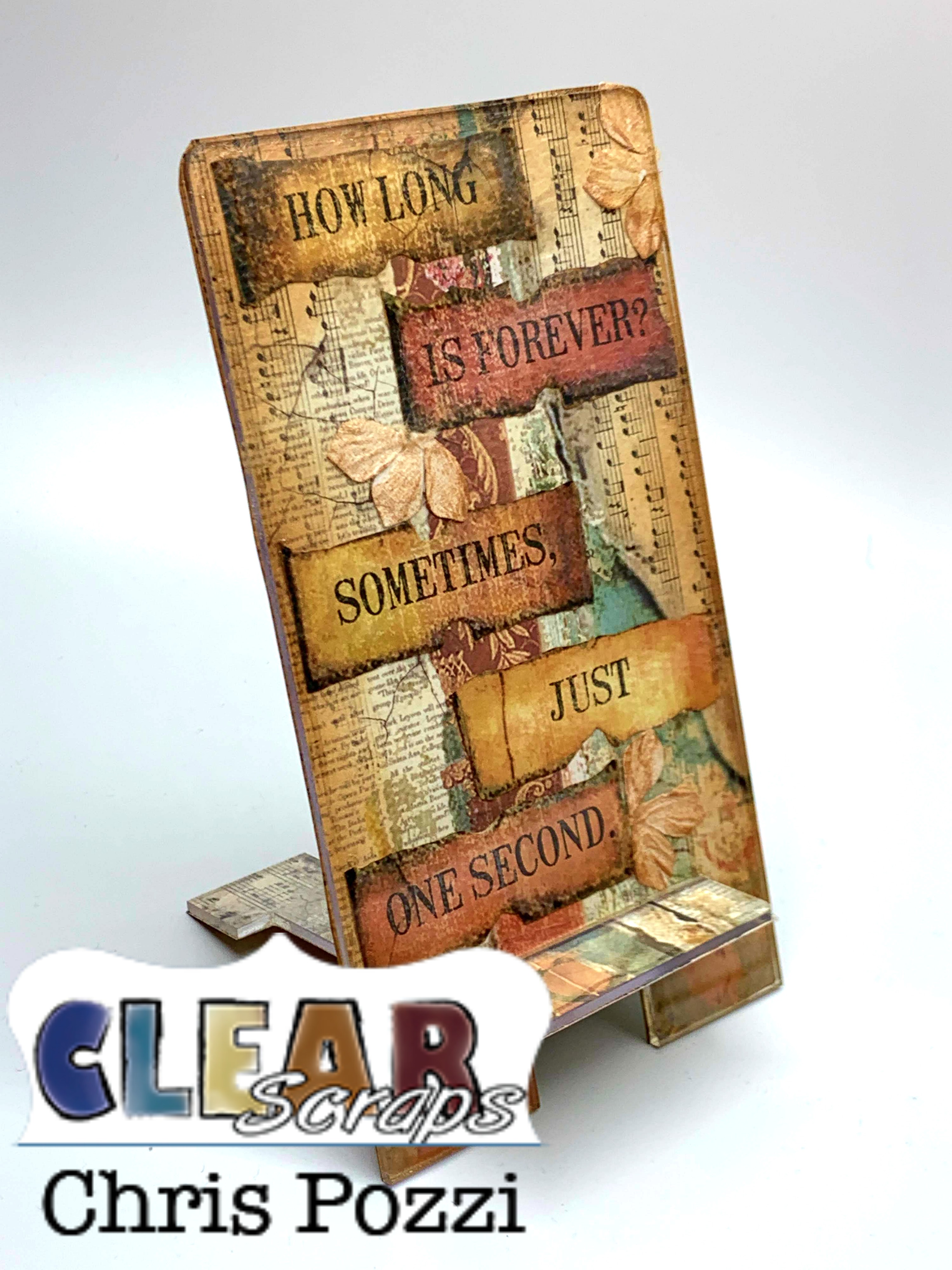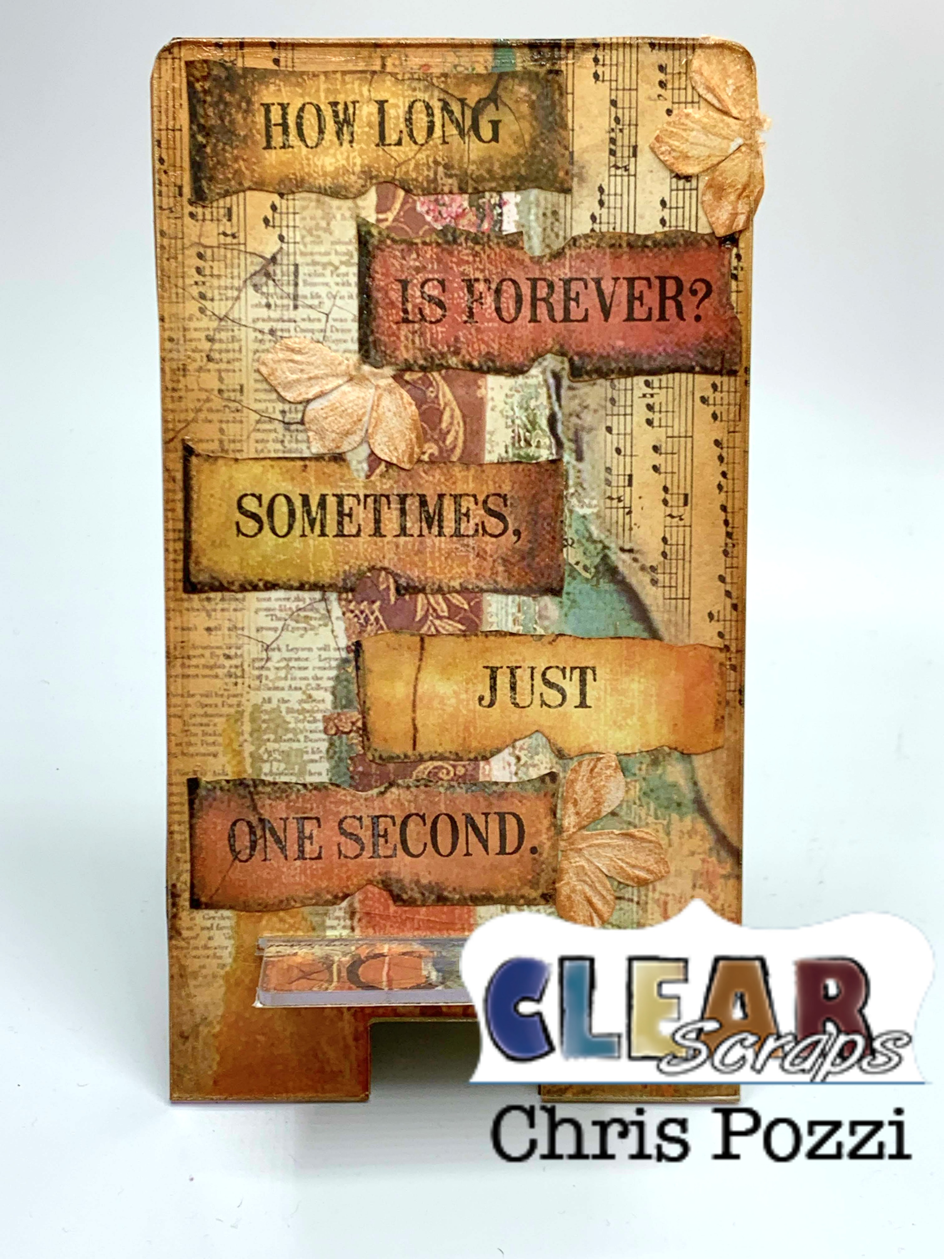 The transparency of the acrylic also allows you to select the "perfect" part of your papers to frame. After I selected the perfect area of my papers, I traced and cut the phone stand out. I cut the sentiment out and inked all the edges.