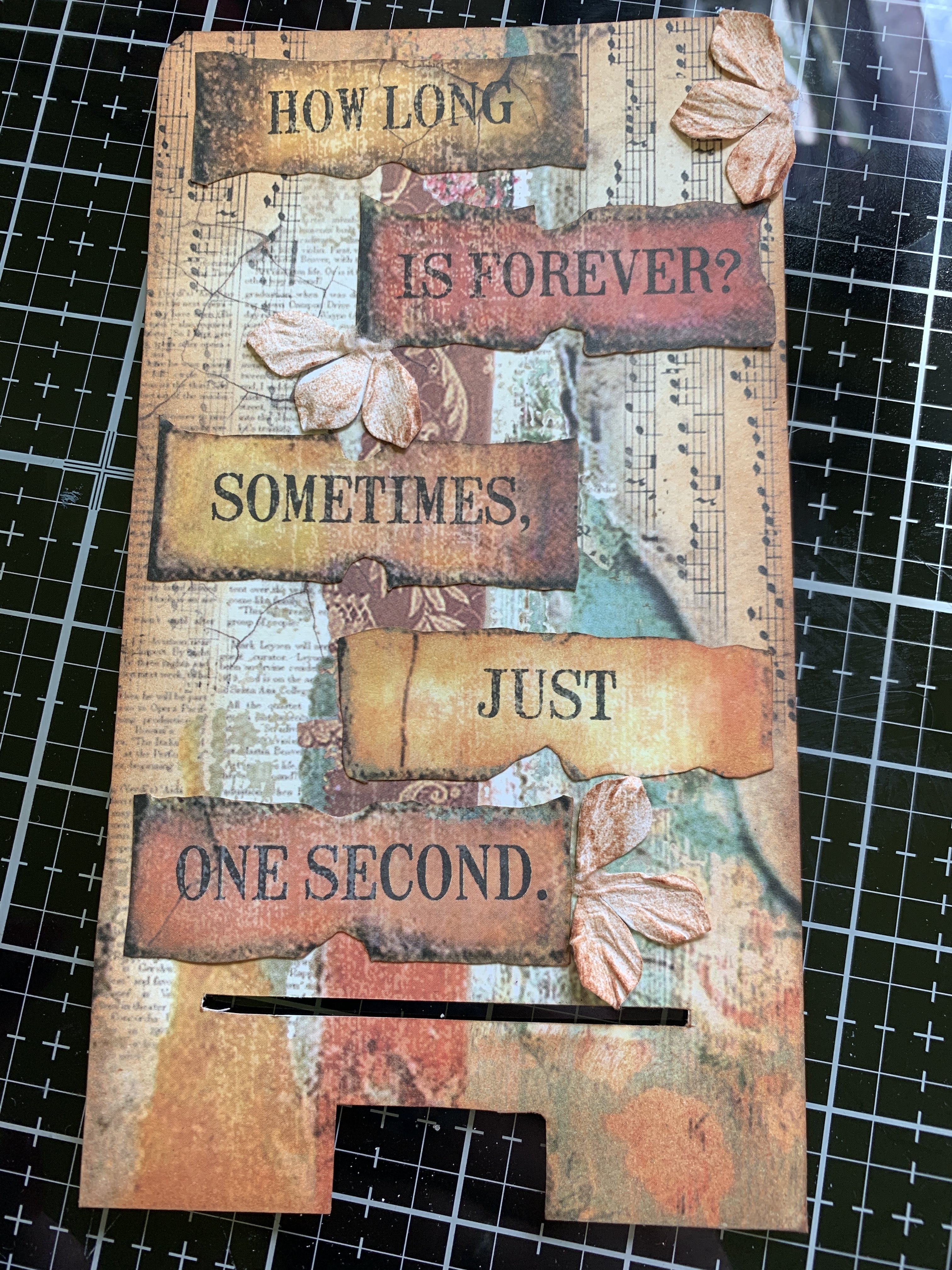 Adhere the sentiment and some inked paper flowers onto the "paper" phone stand.