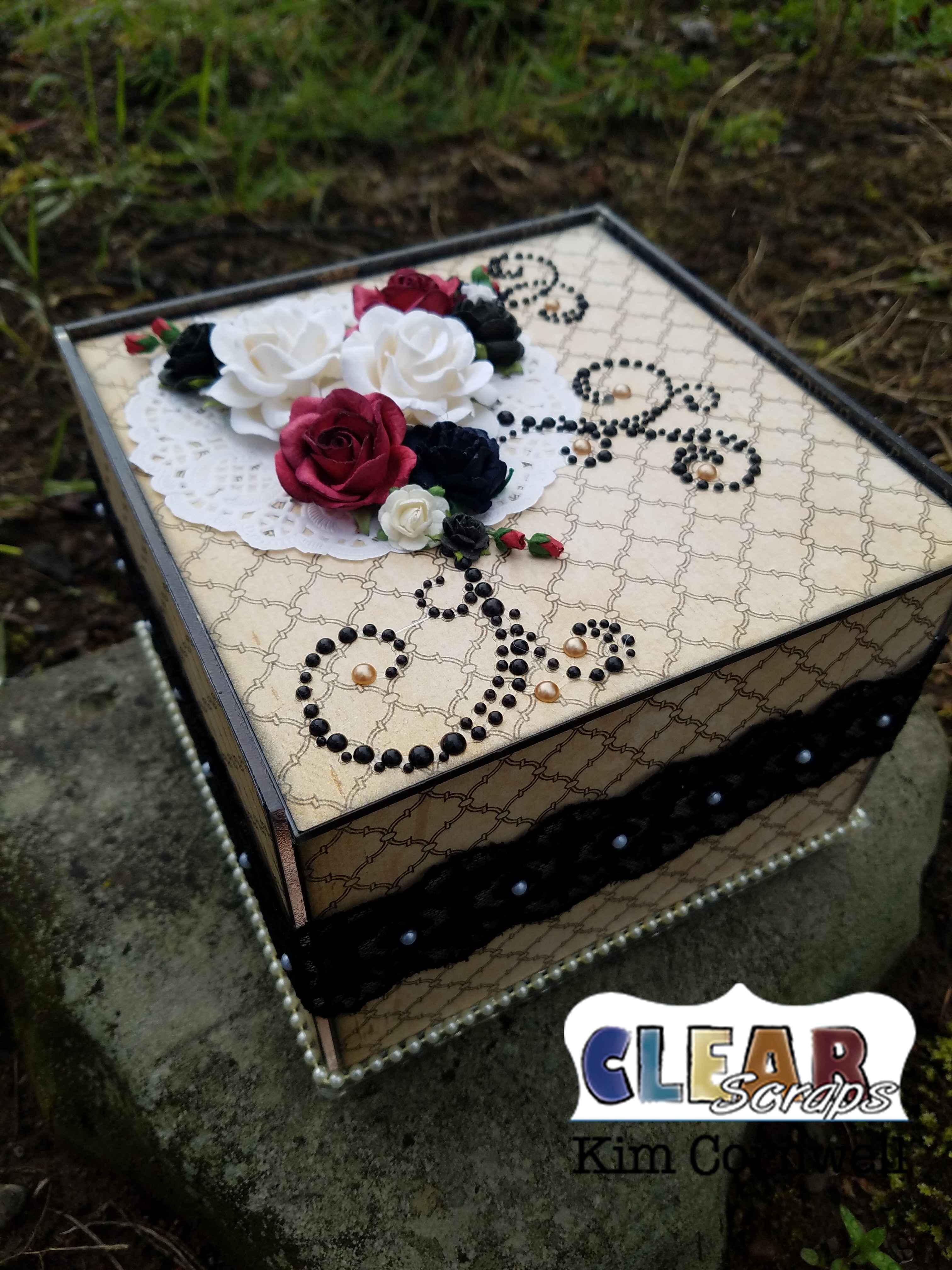 Assembling this box was so simple to do. I used glossy accents and hot glue to keep the box together. I covered it with pattern paper which is double sided so it even looks nice on the inside. I inked the edges of all the paper with distress ink. Once assembled I wrapped some black lace around the whole box. I then added some flat back pearls to embellish the lace.
