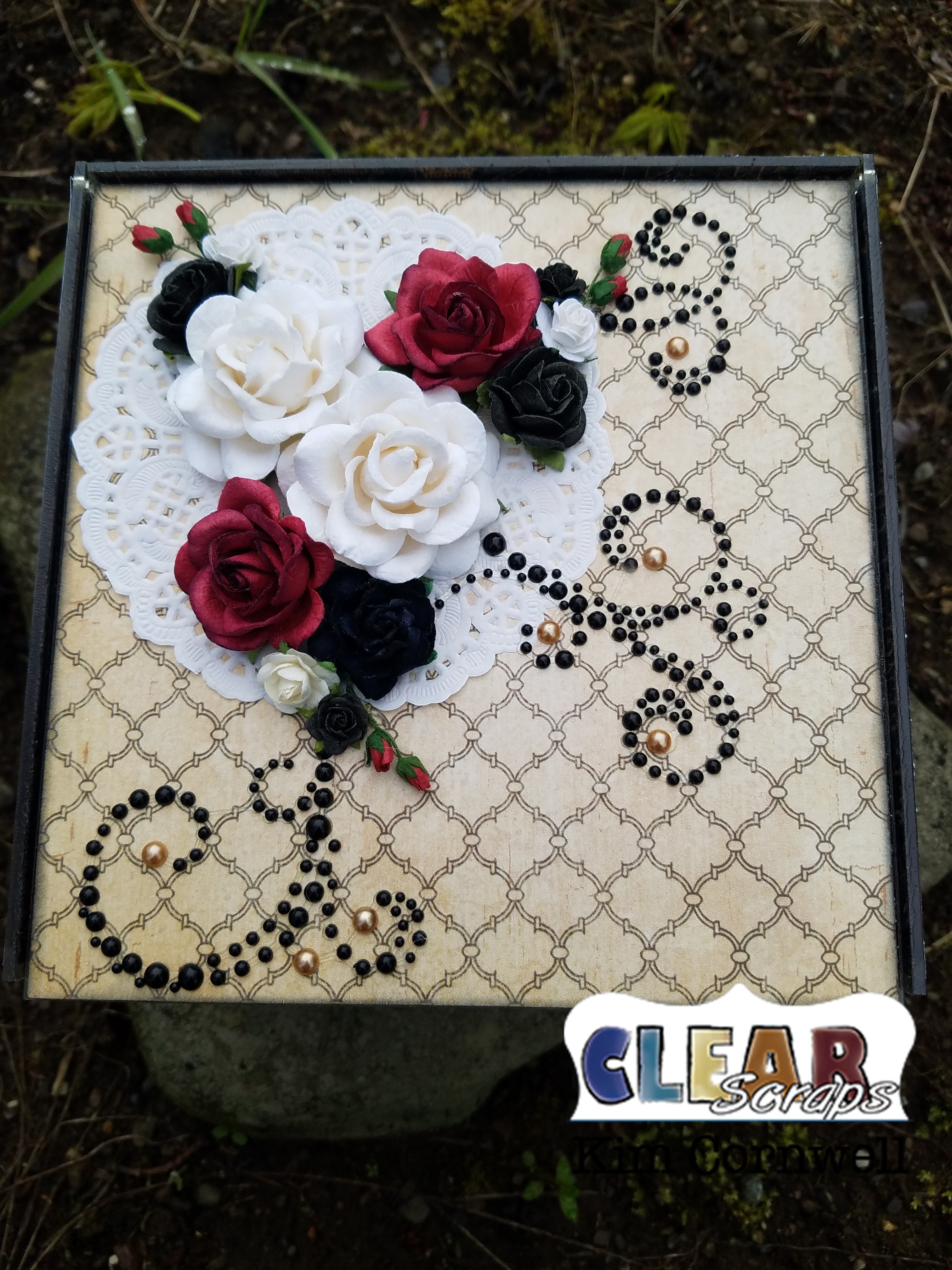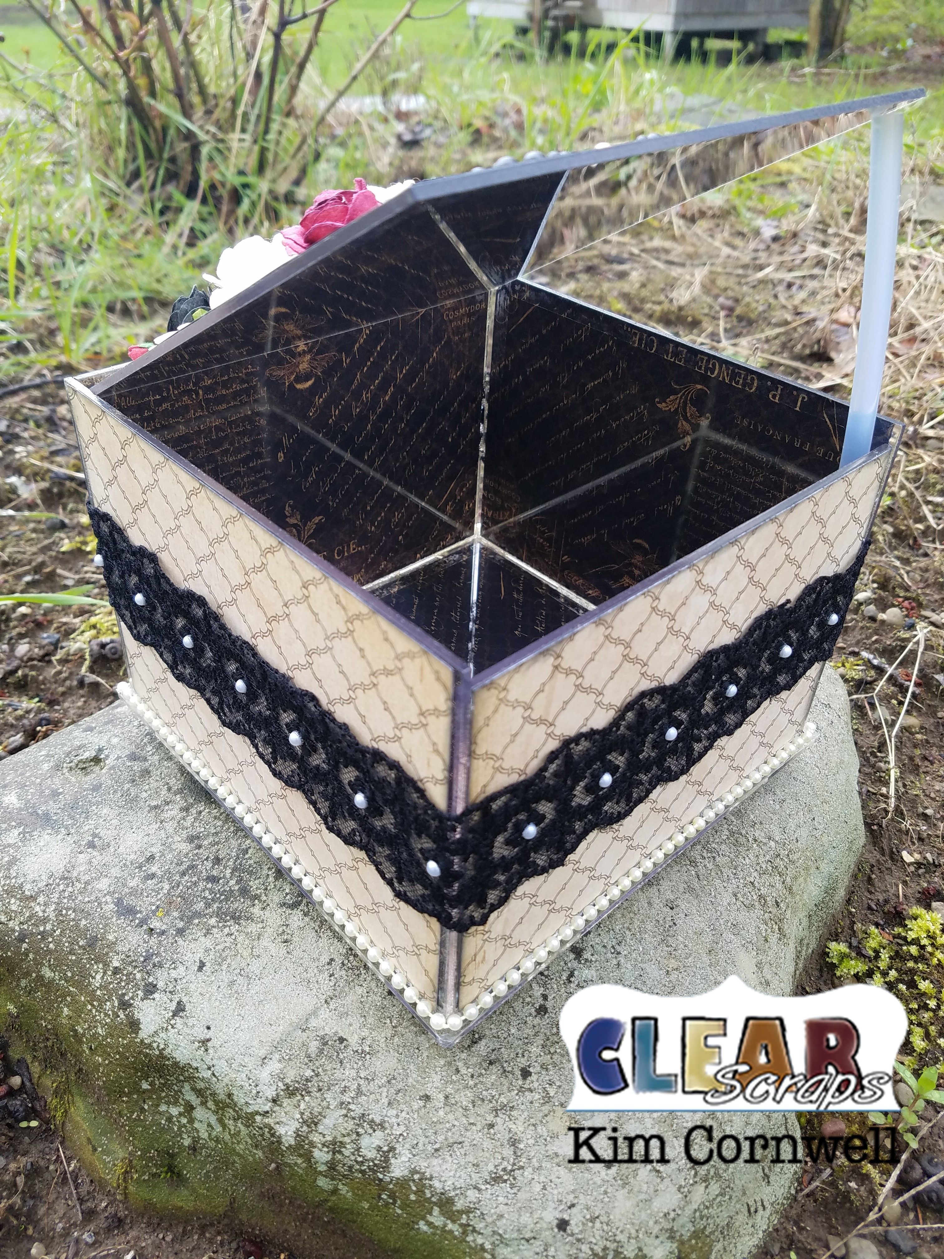 Hello Everyone! Design team member Kim Cornwell here to share my design team project. I have altered this lovely Acrylic Box. I love boxes and this one was perfect for my desk to hold just about anything.