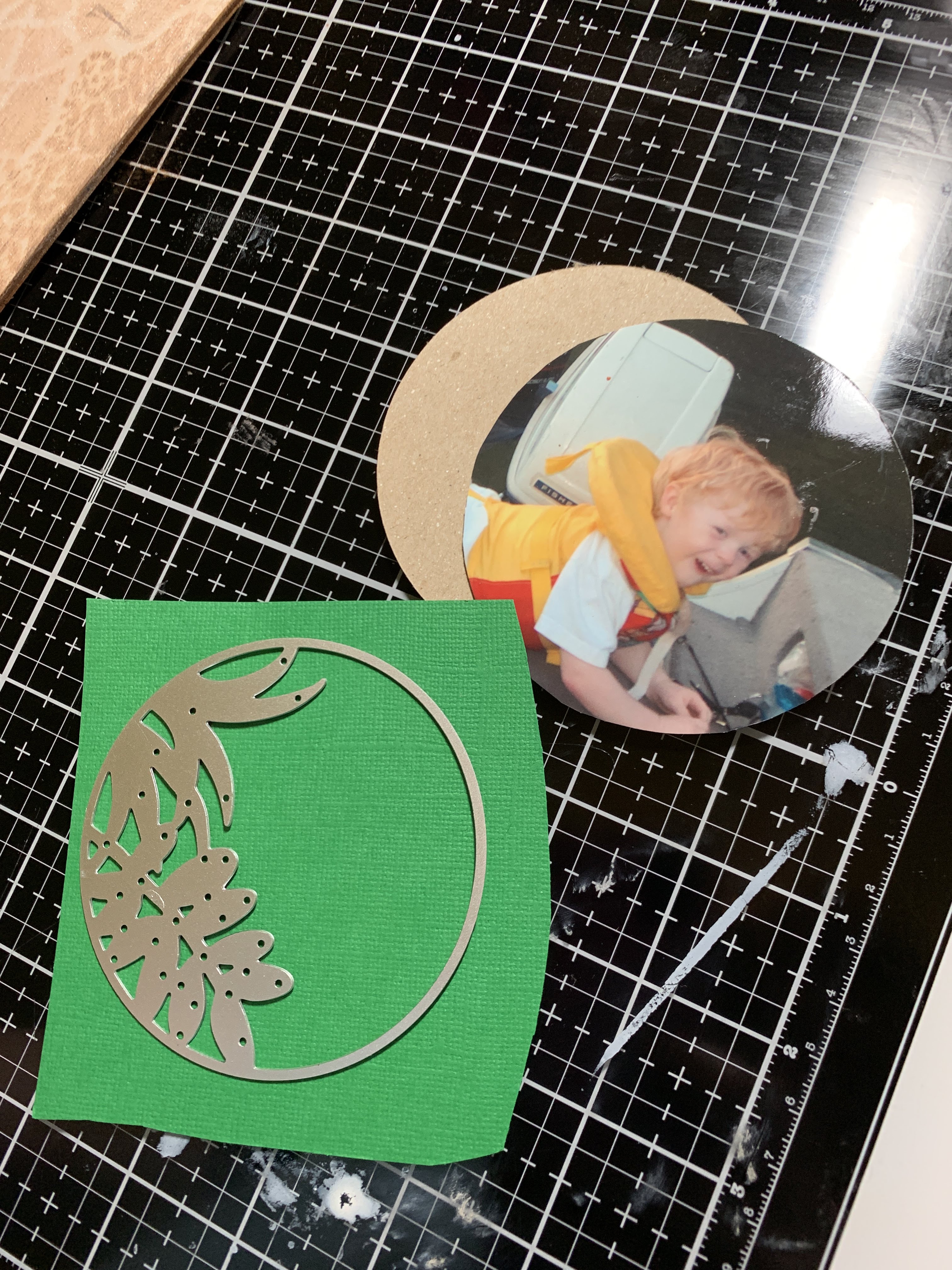 Cut a 3 1/2 inch circle from cardboard or chipboard to use as your photo backing. Cut your photo to a 3 1/2 inch circle and add to backing.