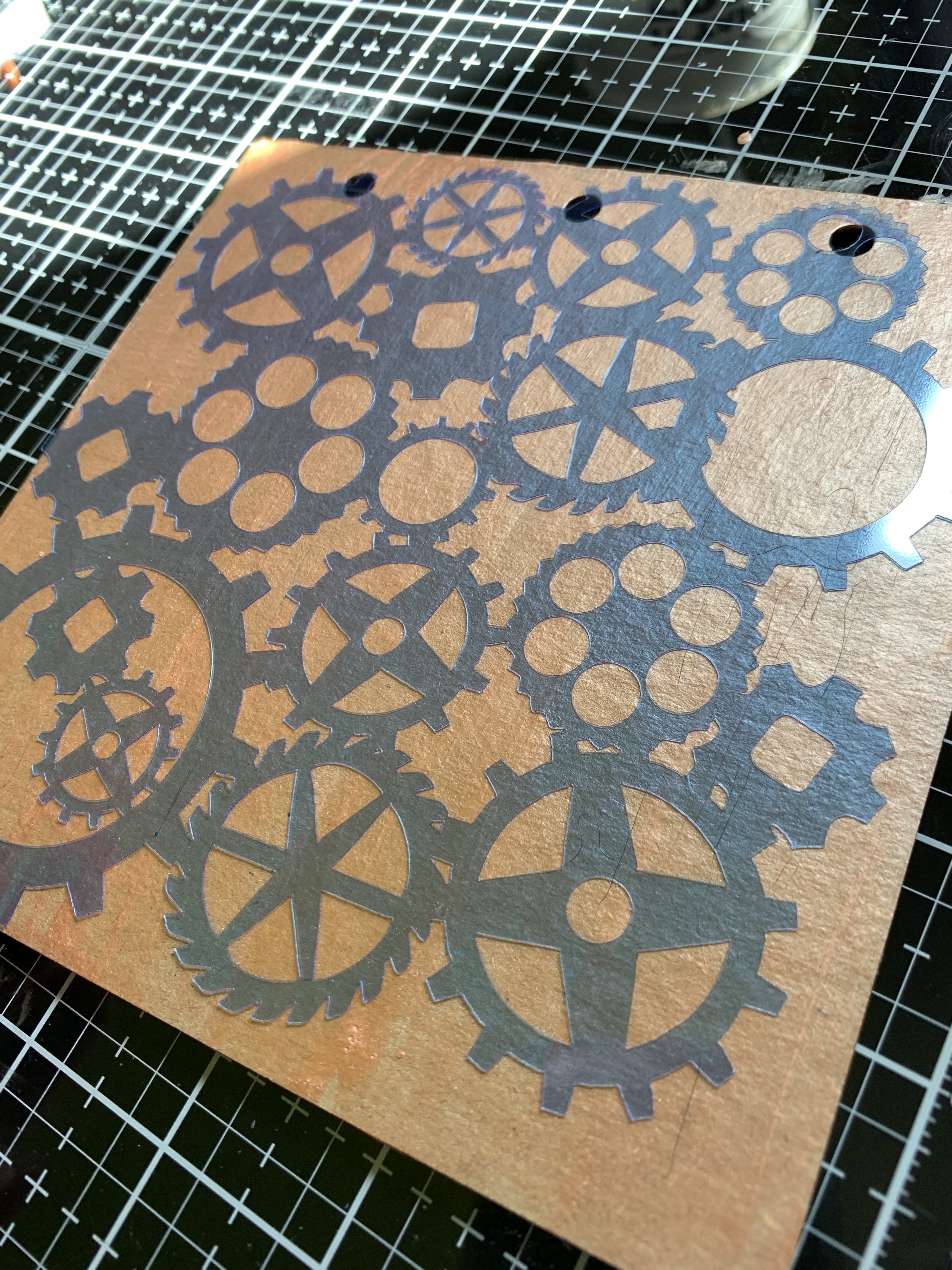 Lay Clear Scraps 6 inch Gears Stencil over dry painted chipboard.