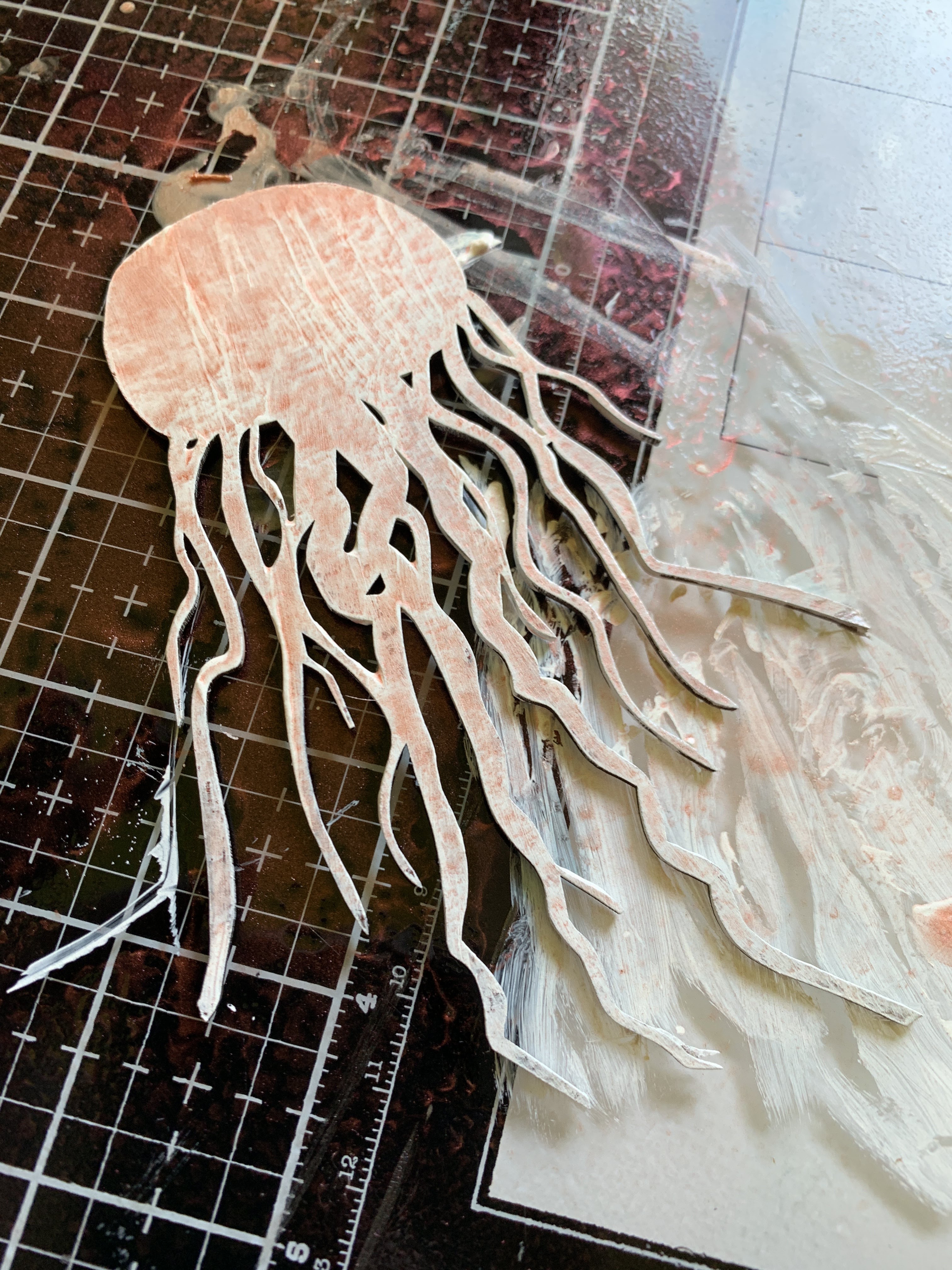 Paint Clear Scraps Jellyfish Chipboard Embellishment white paint. When dry spray with Glimmer Mist. Attach to altered chipboard when dry.