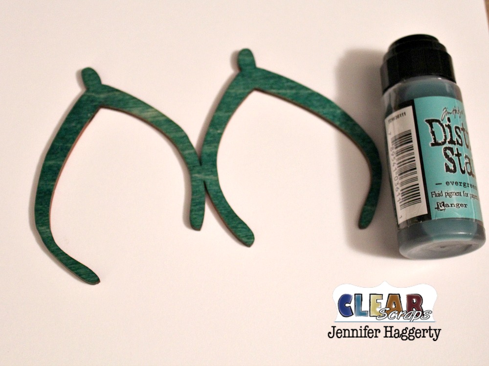 I set aside the main part of the frame to dry and so I could complete my next step. The flip flop portion of the frame has wood cut out that you can embellish. I used Distress Stain in Evergreen Fir to color the wood. It soaks right into the birch and a little goes a long way!
