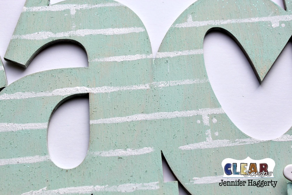 All Wood XL Word Frames are cut from birch and can be painted, stamped, inked, or covered with paper (or a mixture of all the above!). I love using chalk paint on the birch because it dries quickly and it allows the wood grain to show through. I applied a light coat of mint green chalk paint allowing some of the bare wood to show through.