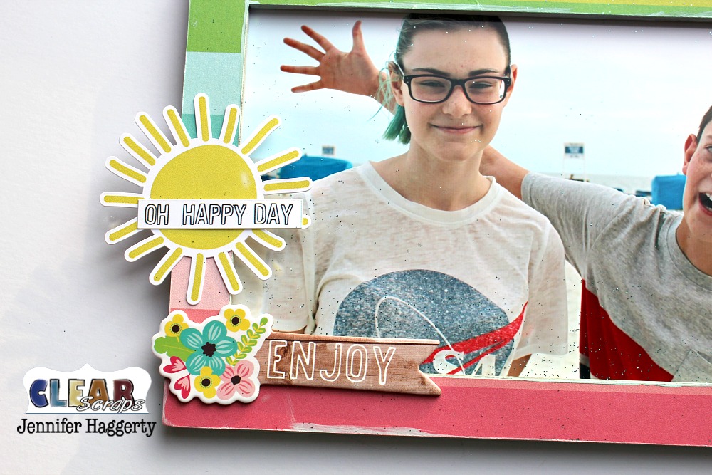 Each of the frames are approximately 5×7 inches and I covered each with bright patterned paper. After adhering my photos to the wood, I used my Beacon 3-in-1 Adhesive to adhere the frames. I then used coordinating stickers and chipboard to accent my photos.