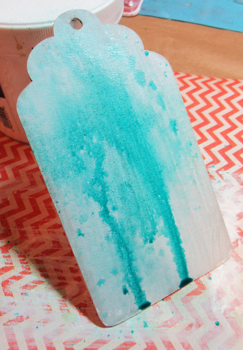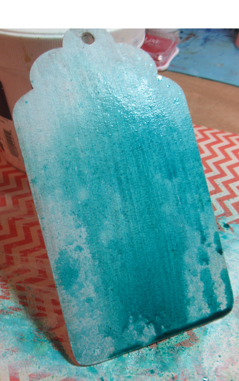 Once dry, I spritzed additional colors of inks to give the tag more life. In the center of the tag, I added more art stones.