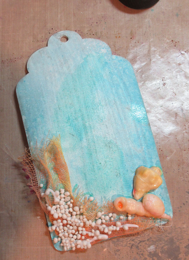 Mesh was also spritzed then adhered to the left corner. I also added several sizes of art stones as well as some sea shells created from Makin's Clay for dimension.