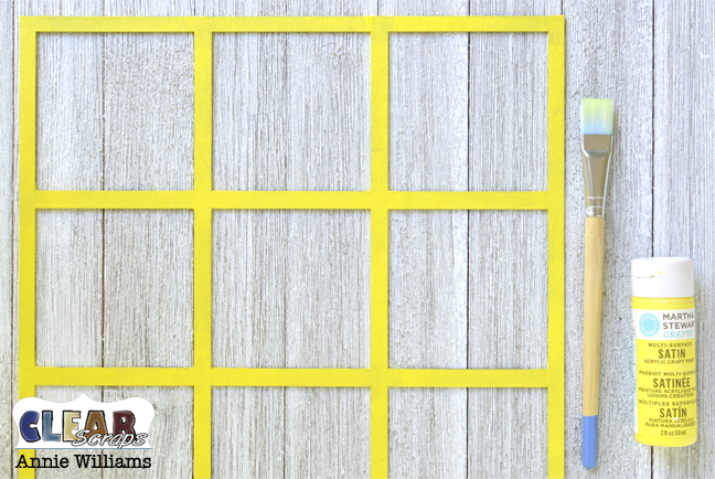 Start by painting one of the chipboard dividers in the Square Printer Tray Frame kit in the color of your choice. Here I've chosen a sunny yellow acrylic paint that matches the summery scrapbook paper I'll be using on the rest of the board.