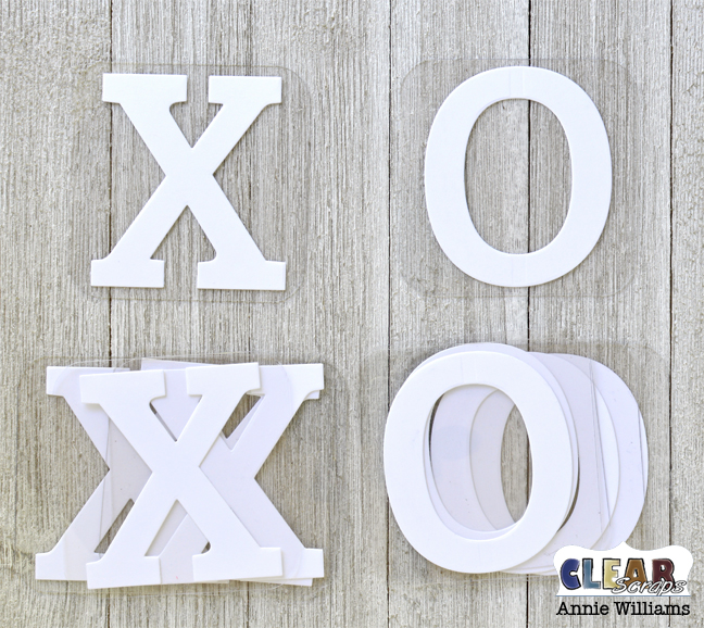 Die cut at least five X's and five O's from white cardstock (this shows up well on busy backgrounds like mine). Alternatively, choose two different shapes that match the theme of your game board.