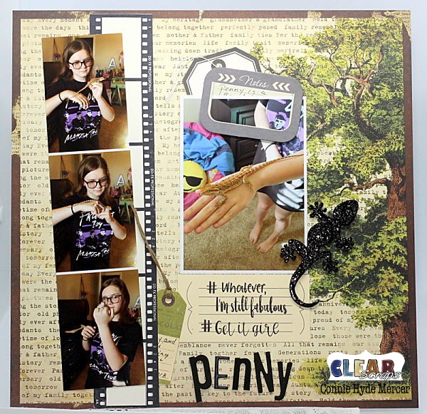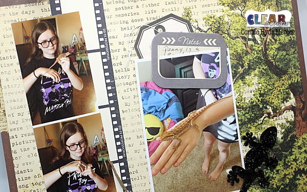 Hi, Connie here with a scrapbook page using the Geckos Chipboard embellishments by Clear Scraps!!! They were so perfect for this page. Let me show you why I say that~